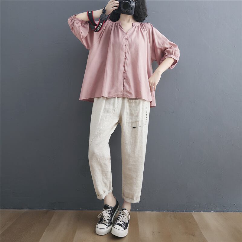 ラージサイズの女性用ルーズリテラシー七分袖シャツ夏新作無地ワイルドカジュアル通気性リネントップタイド 大きめサイズ サマー 夏物 ソリッドカラー TB2-12 TB2-1267965408481