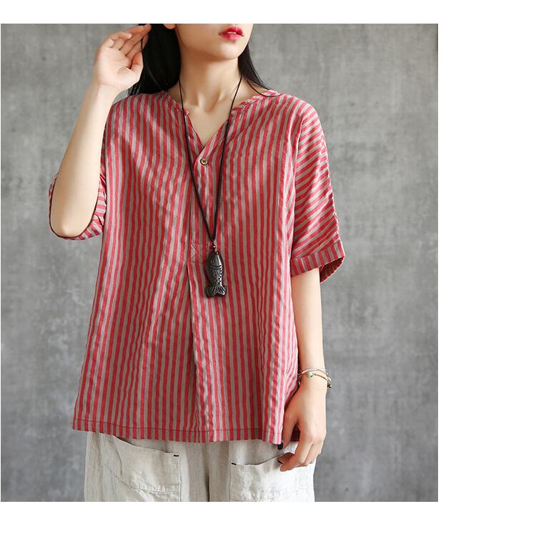 レトロアートプラスサイズ2020夏ニューエイジリダクションルーズコットンとリネンストライプ半袖シャツオールマッチVネックトップ 大きめサイズ サマー 夏物 TB2-11 TB2-1196480723398