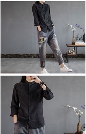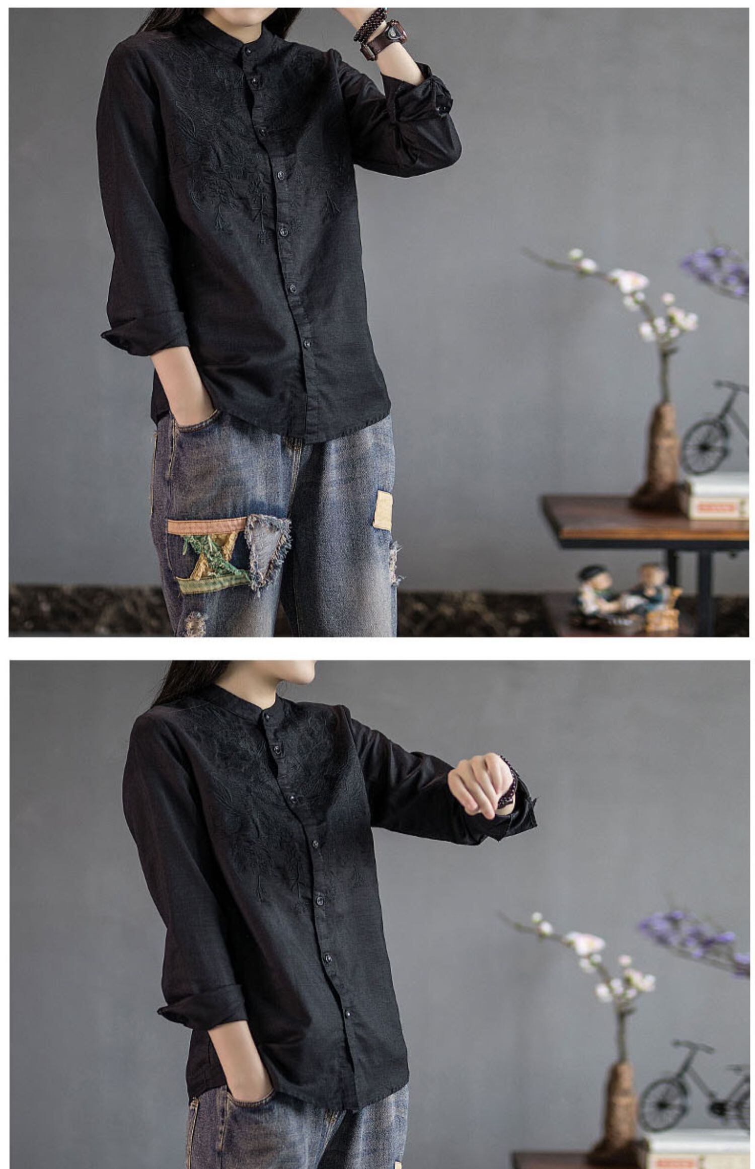 文学と芸術のバージョン綿とリネンの刺繍シャツ女性の春と夏のラペル長袖トップルーズリネン綿カジュアルボトミングシャツ ロング レッド コットン スプリング 春物 サマー 夏物 TB2-11 TB2-1177297138889
