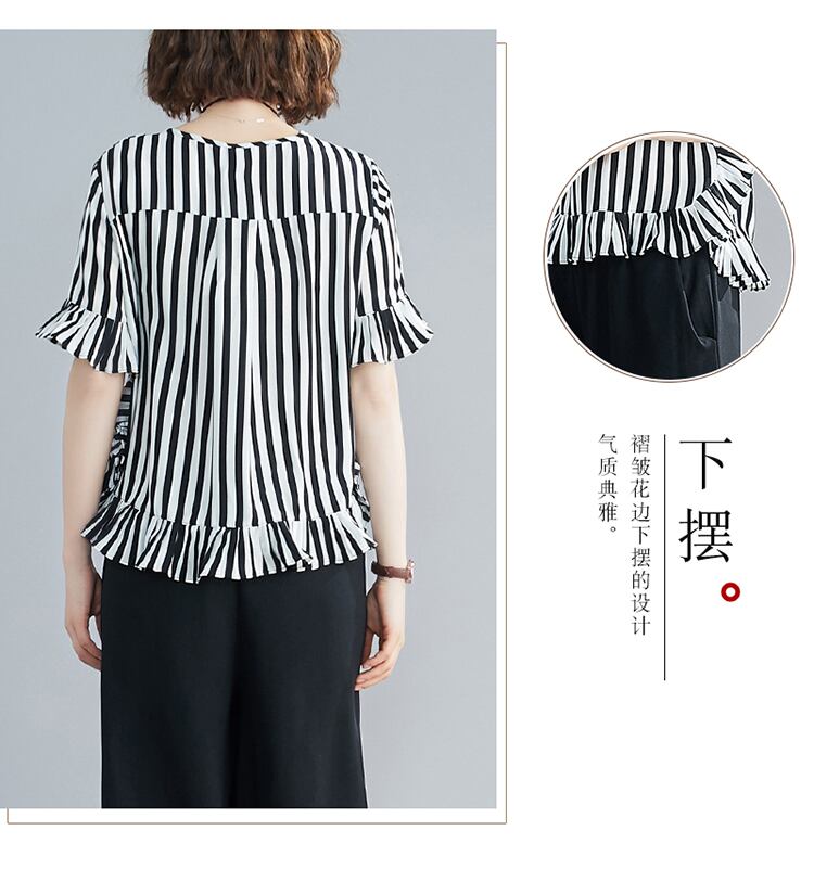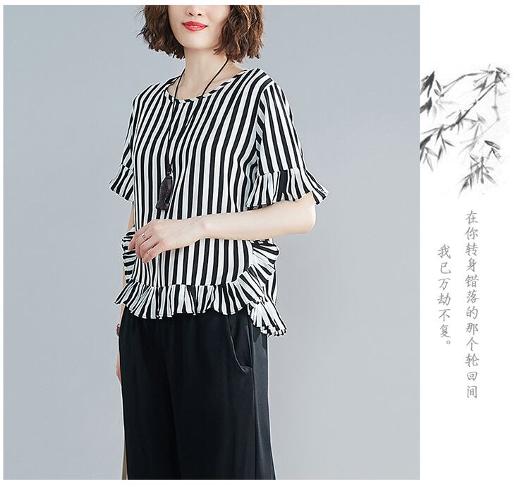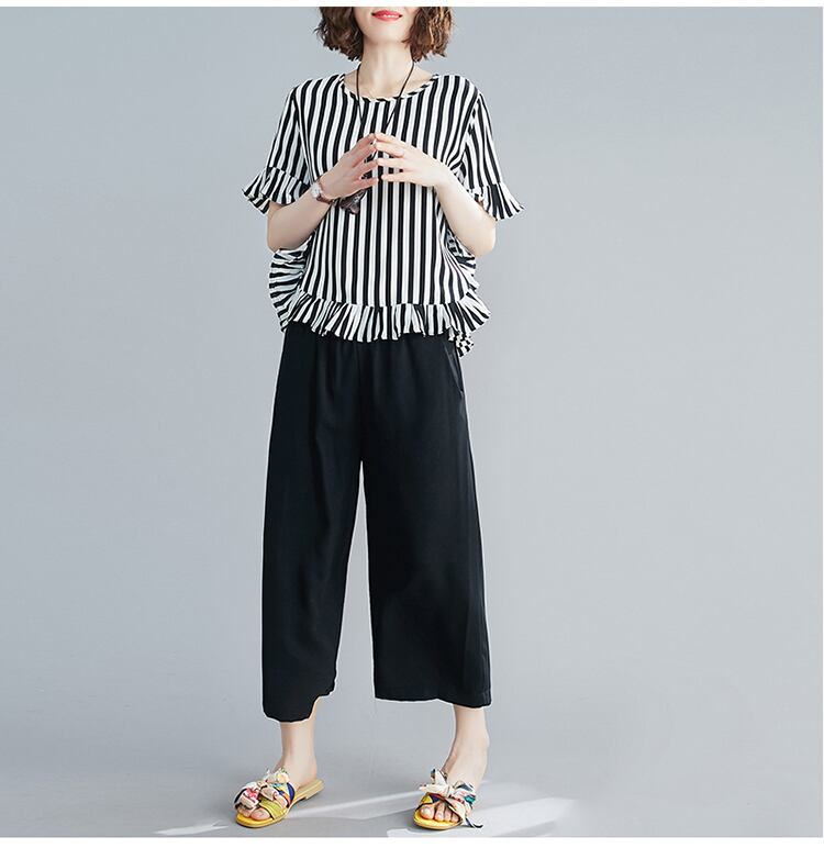 お腹を覆う太った女性とスリミングスーツラージサイズのフリルストライプTシャツ+無地ワイドレッグパンツ夏新作2021年 大きめサイズ サマー 夏物 ソリッドカラー TB2-213351250655