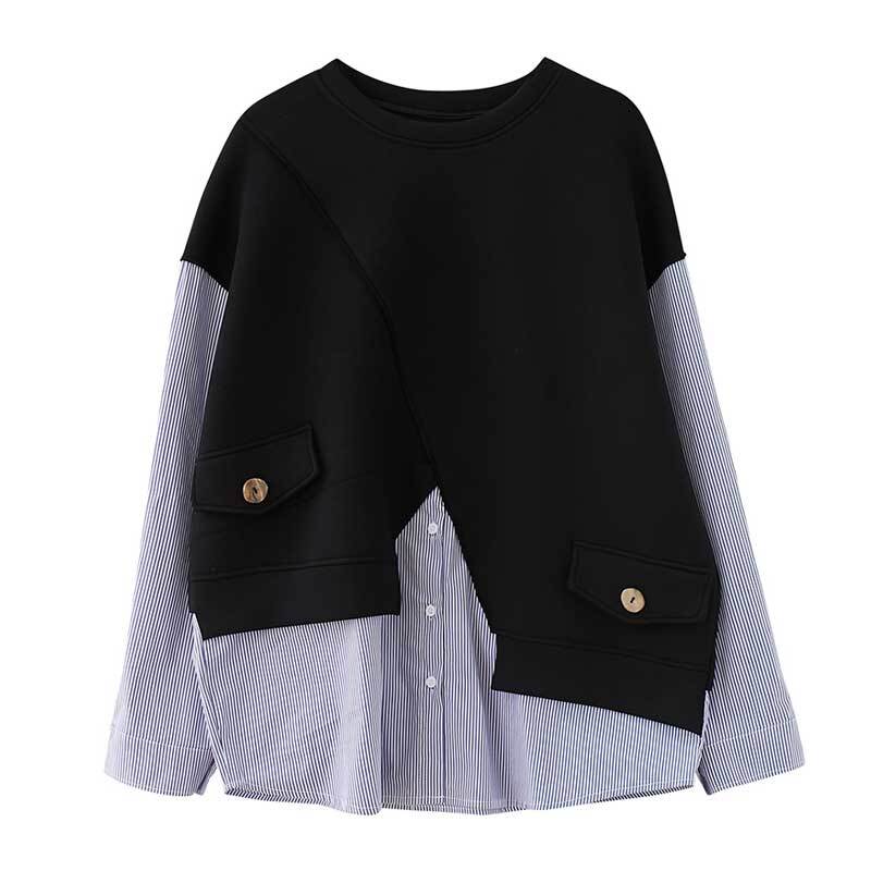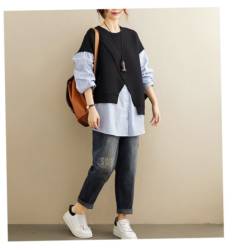 秋冬の新作2021年プラスサイズのストライプシャツステッチセーター女性ルーズで薄いファットシスターラウンドネック長袖トップス ロング 大きめサイズ オータム 秋物 ウィンター 冬物 Oネック TB2-288584851485
