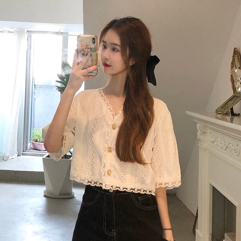 ホワイトホロー半袖シフォンシャツレディースサマードレス2021新しいスーパーフェアリーVネックスウィートセンショートスモールシャツトップ 大人ガーリー キュート カジュアル 夏物 TB2 TB277559847448