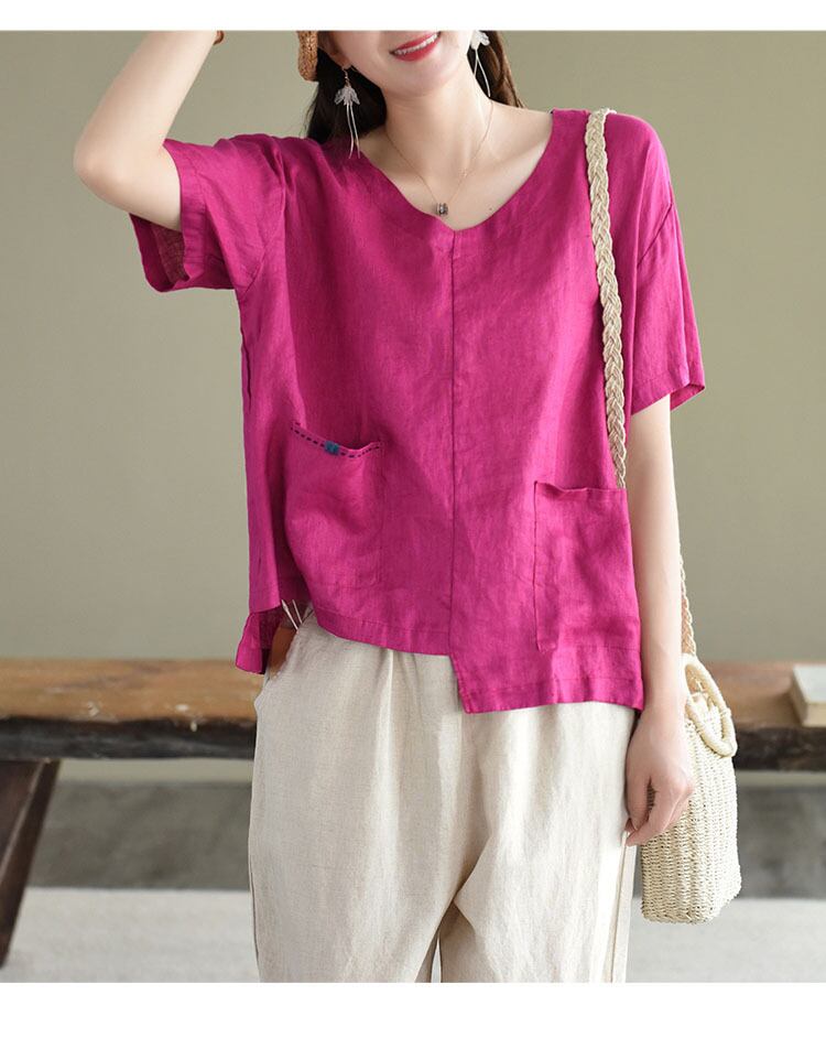 2020年夏のニュースタイルコットンとリネンレトロリテラリーフックラインリネントップオールマッチルーズ半袖TシャツレディースプルオーバーVネック サマー 夏物 TB2-11 TB2-1150091283798
