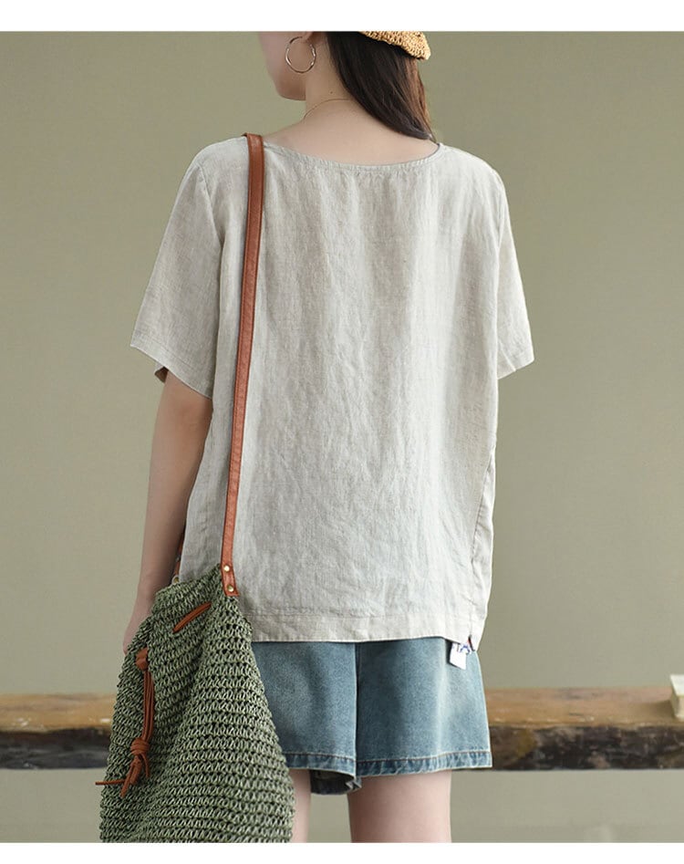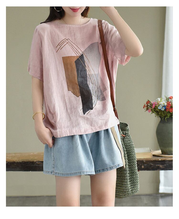 文学的な幾何学模様の綿とリネンの半袖Tシャツ女性の2021年の新しいカジュアルなルーズラージサイズのリネントップ コットン 大きめサイズ TB2-11 TB2-1198958518525