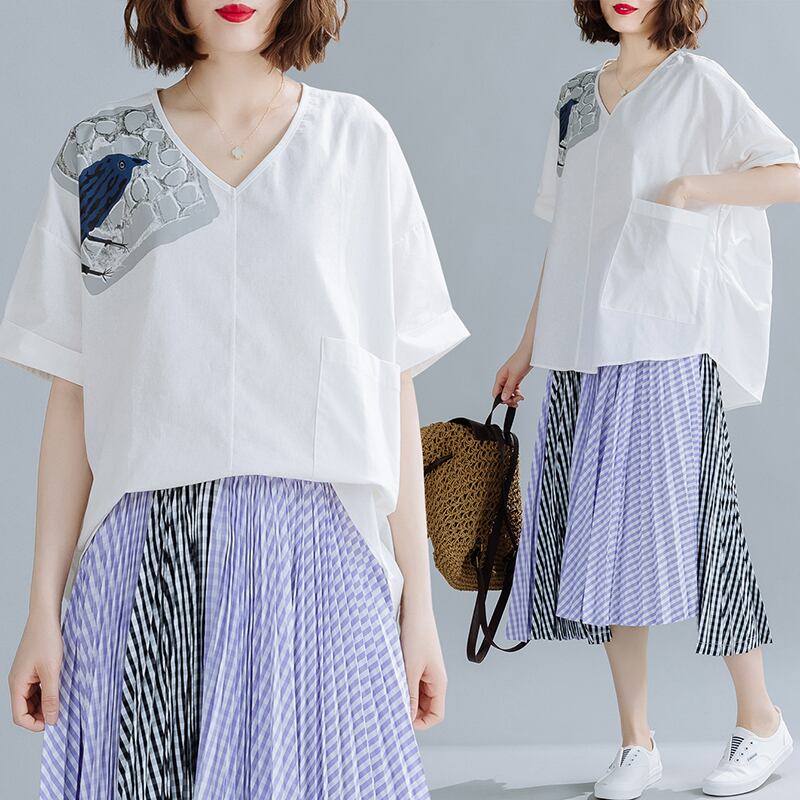 特大サイズの女性用Tシャツルーズカバー腹2021年夏新太姉妹年齢減りVネックプリントトップ200kg 大きめサイズ サマー 夏物 TB2-298558125936