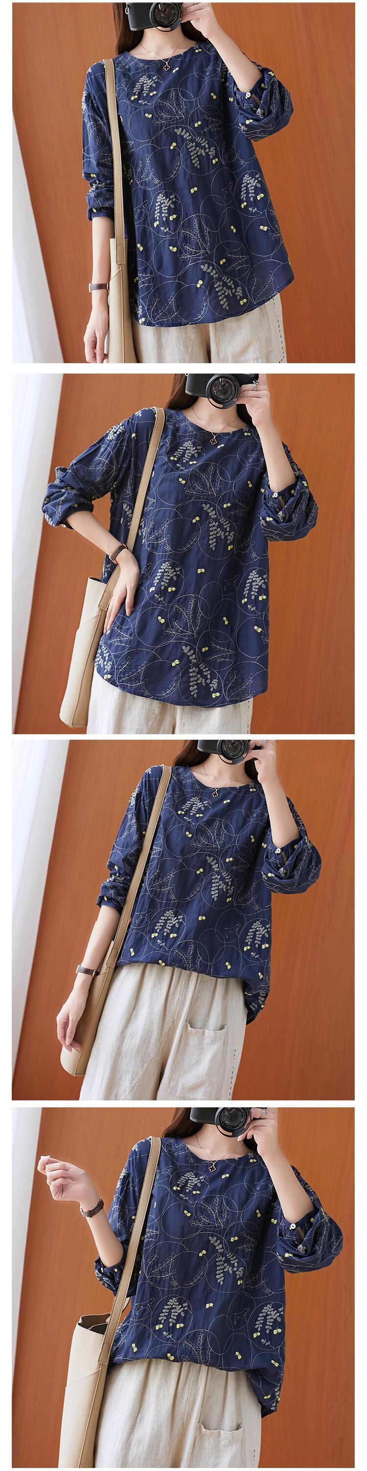 コットンとリネンの長袖Tシャツレディース秋ルーズラージサイズボトミングシャツ肌を覆う洋風と薄手のランタンスリーブ刺繡トップタイド ロング 刺繍 大きめサイズ オータム 秋物 TB2-8 TB2-891064894676
