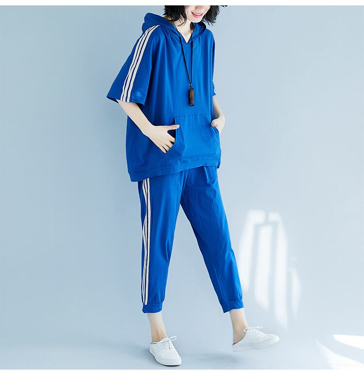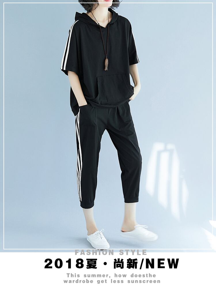 ファットシスタースリムスーツ女性夏ルーズプラスサイズフード付きトップオールマッチクロップドパンツカジュアルスポーツツーピース 大きめサイズ サマー 夏物 TB2-8 TB2-833290922921