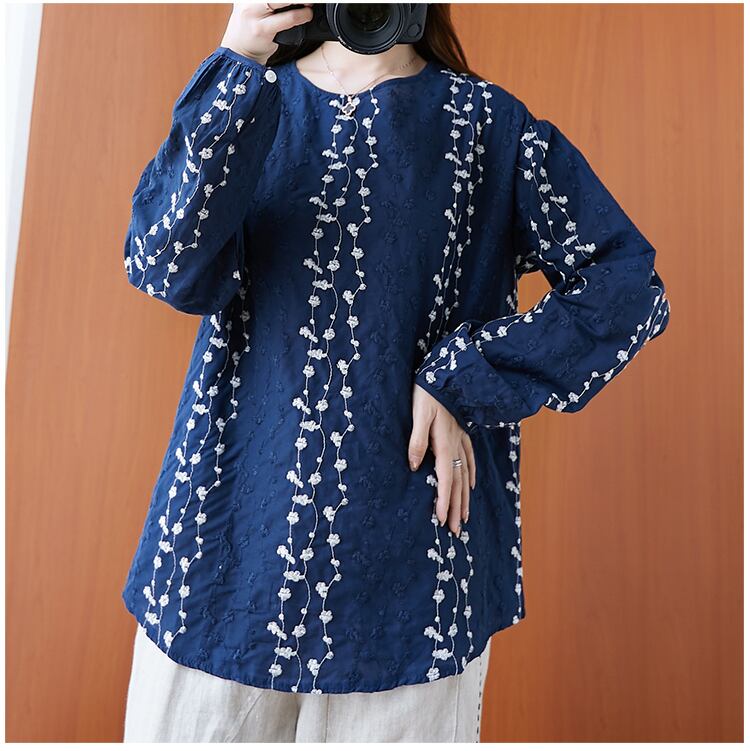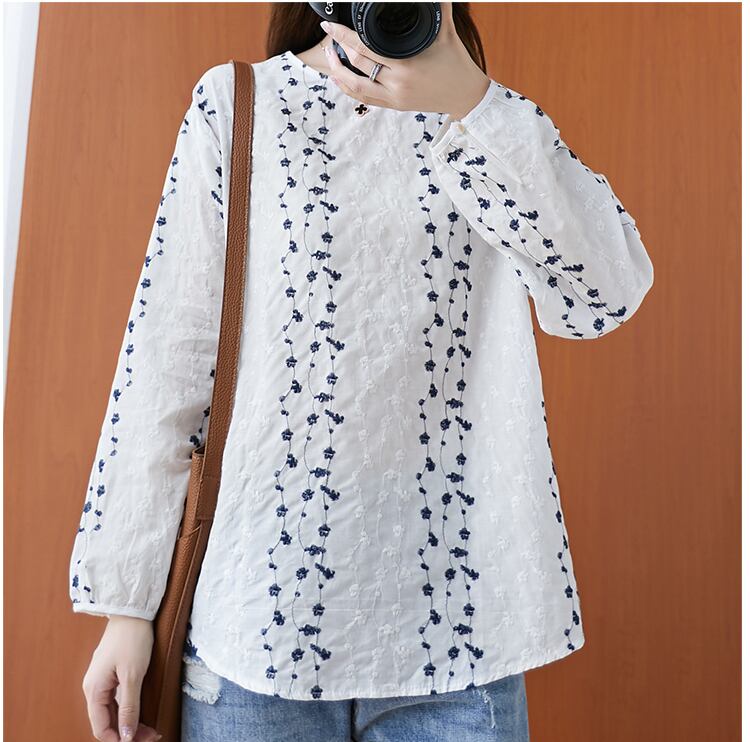 2021年春の新作文芸ルーズコットン&リネン長袖Tシャツレディースラウンドネックカジュアル刺繡ボトミングシャツウエスタンスタイルブラウス ロング 刺繍 スプリング 春物 Oネック TB2-12 TB2-1264418878668