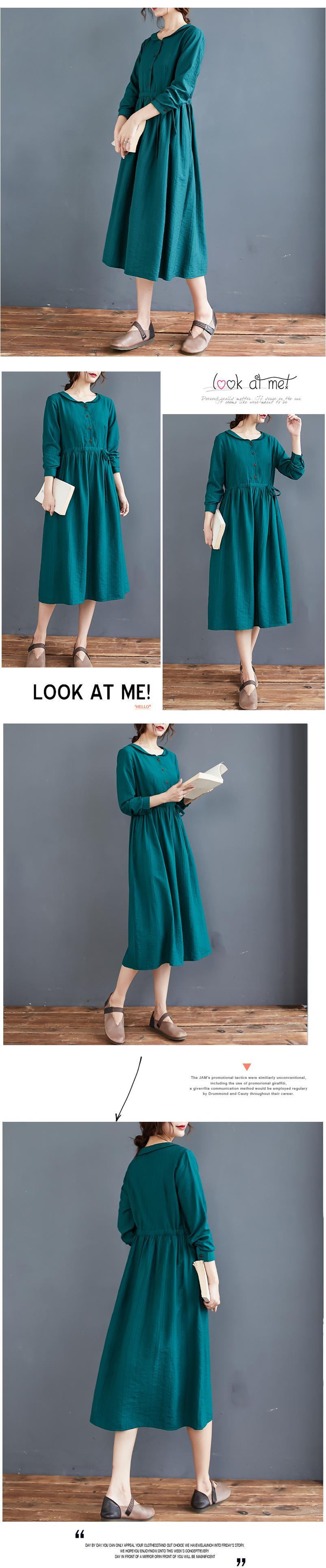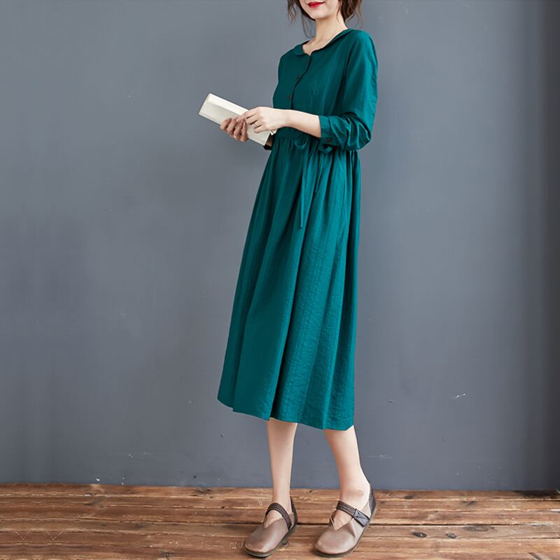2021年春の新作レトロ文芸人形衿無地ウエストスリミングオールマッチミディアムロングカジュアル長袖ワンピース スプリング 春物 ソリッドカラー TB2-12 TB2-1266770138763