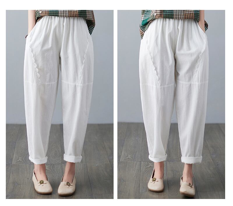 2021年夏の文芸無地ステッチリネンカジュアルパンツ女性ルーズラージサイズハーレムパンツコットンとリネン伸縮性ウエストパンツ エラスティック 大きめサイズ サマー 夏物 ソリッドカラー TB2-12 TB2-1275441218804