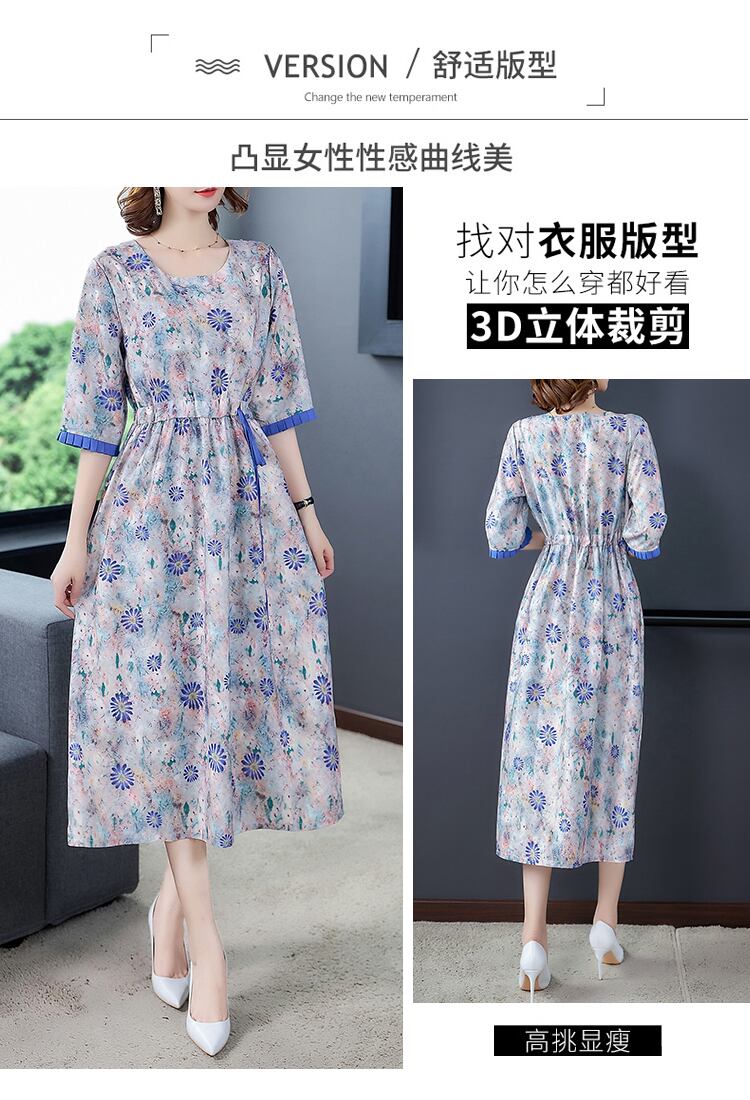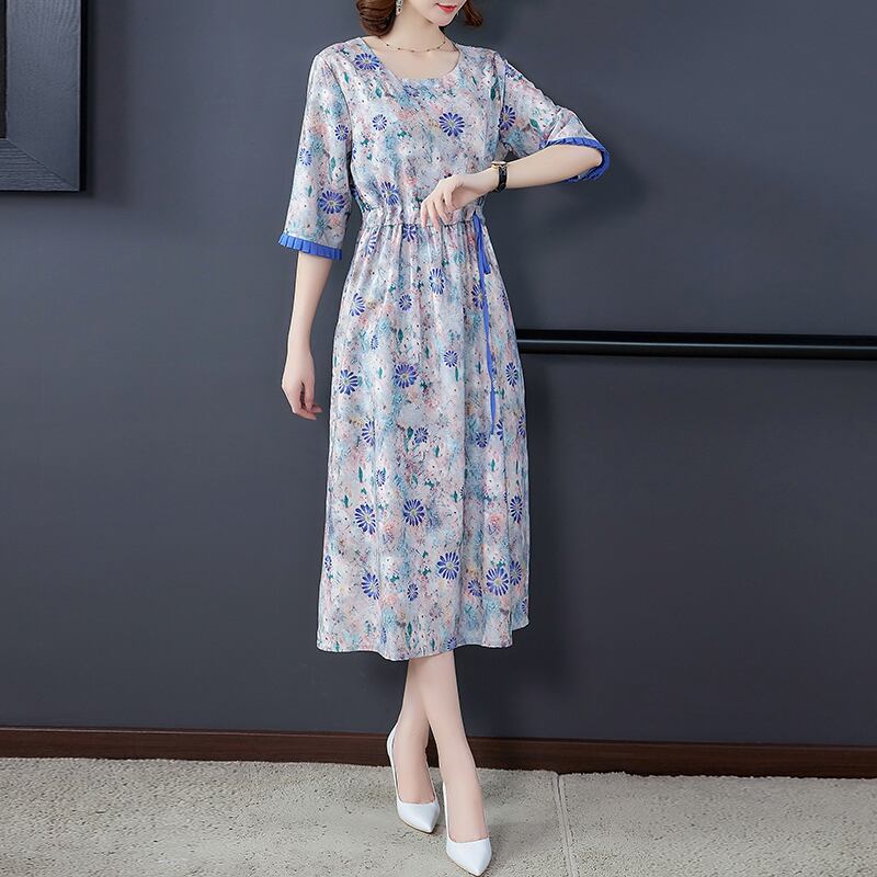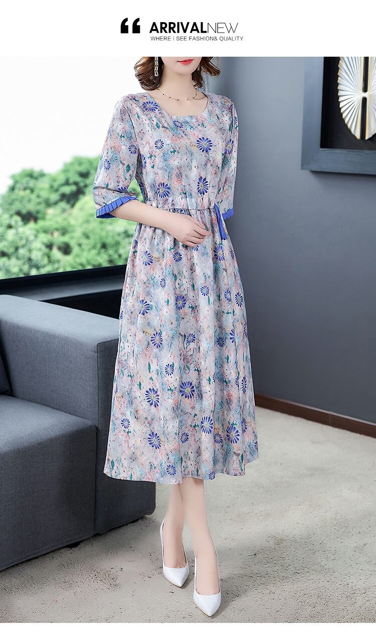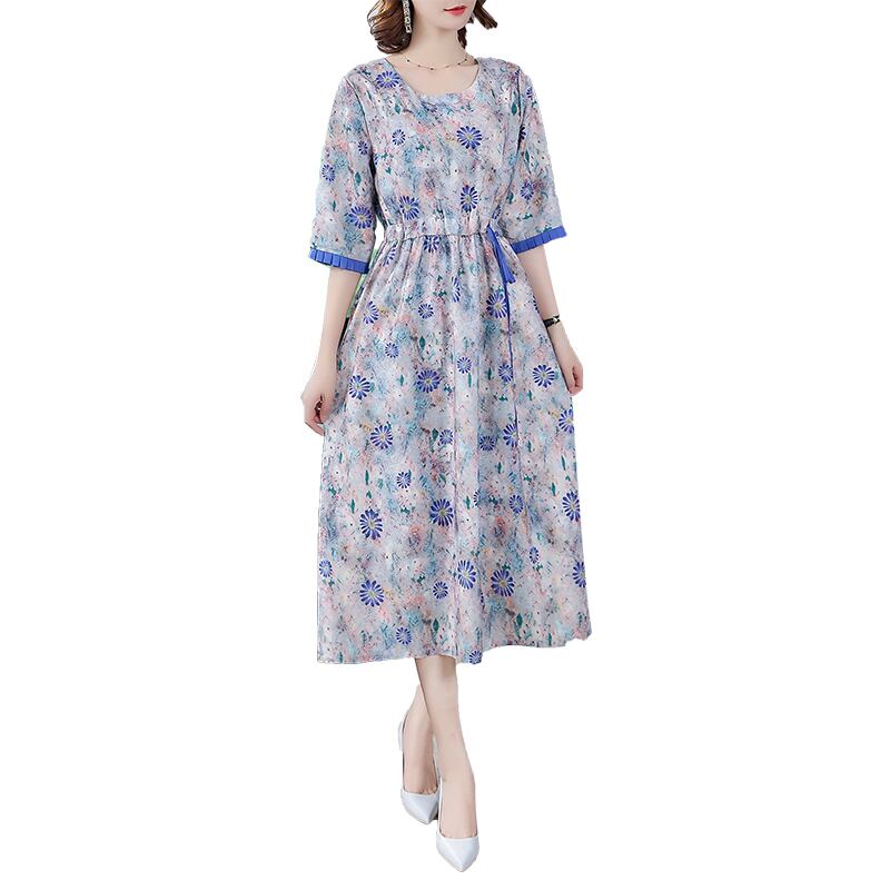 レトロプリントルーズラウンドネックリテラリーロングスカート七分袖気質ステッチスモールデイジーフローラルリネンロングスカート 花柄 Oネック TB2-12 TB2-1279923035275