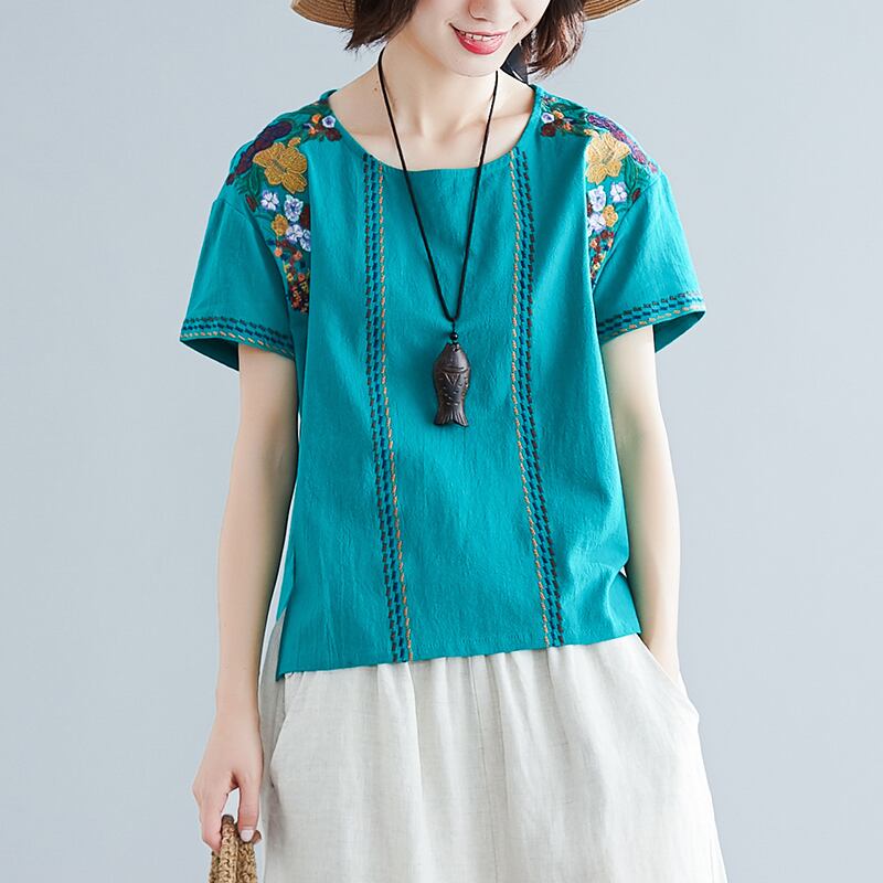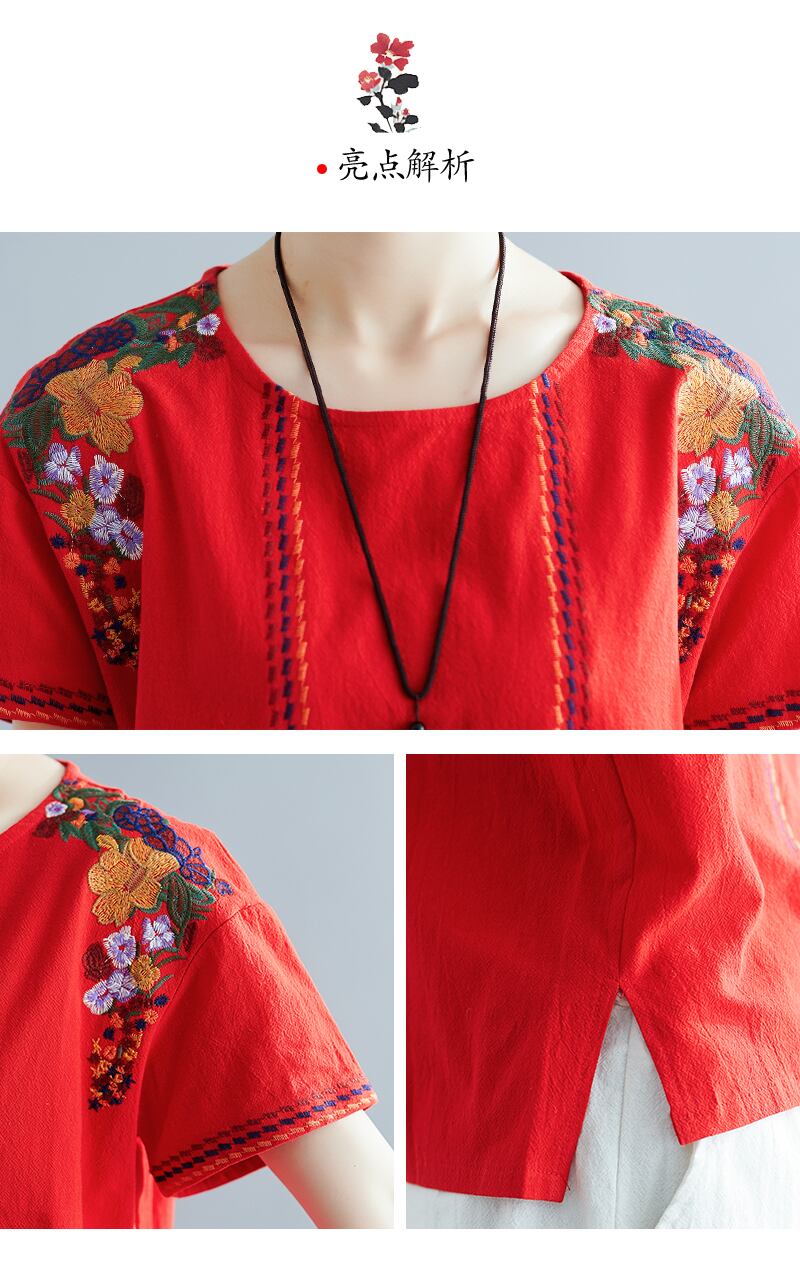 2020年新作リネン半袖Tシャツ薄手ラウンドネック刺繡ショートブラウスレトロ文芸ルーズトレンド 刺繍 Oネック TB2-12 TB2-1210418619228