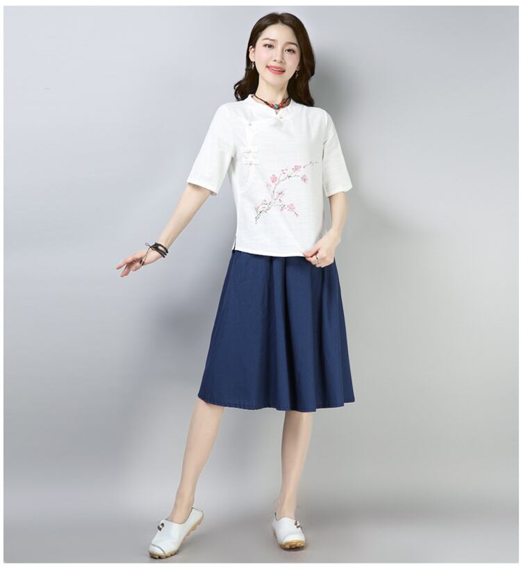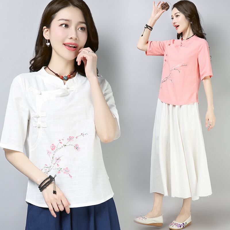 2021年夏の中国風の文芸的プリントティードレスコットンとリネンシャツの女性は、中国のスタンドアップカラーボタン半袖Tシャツを緩めます サマー 夏物 TB2-12 TB2-1285472398080