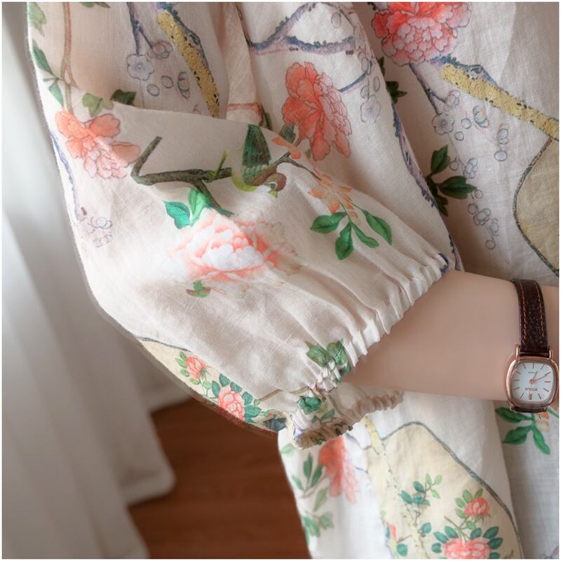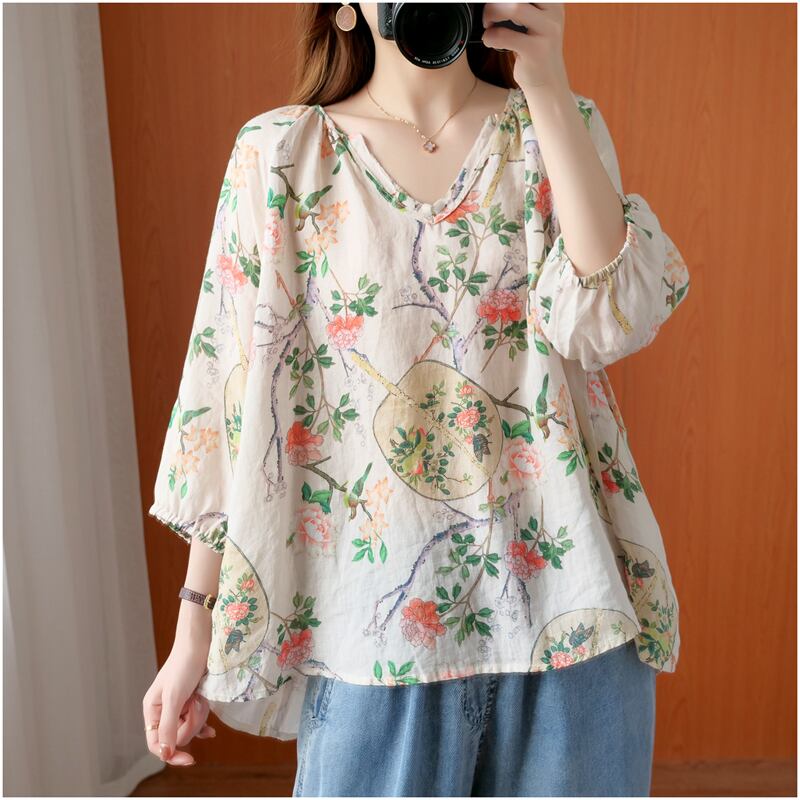 文学と芸術レトロなルーズVネックコットンとリネンプリント七分袖シャツ女性の夏のカバー肉は薄くて薄い日焼け止めトップでした サマー 夏物 TB2-12 TB2-1255816856400