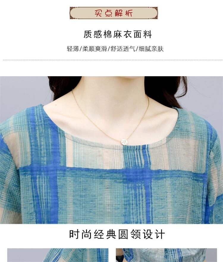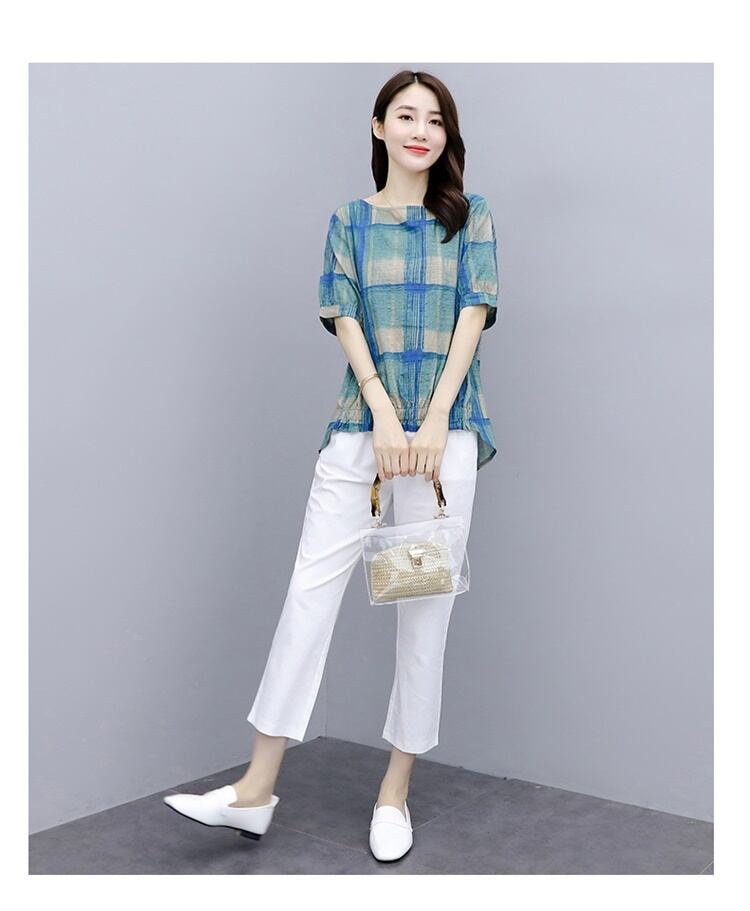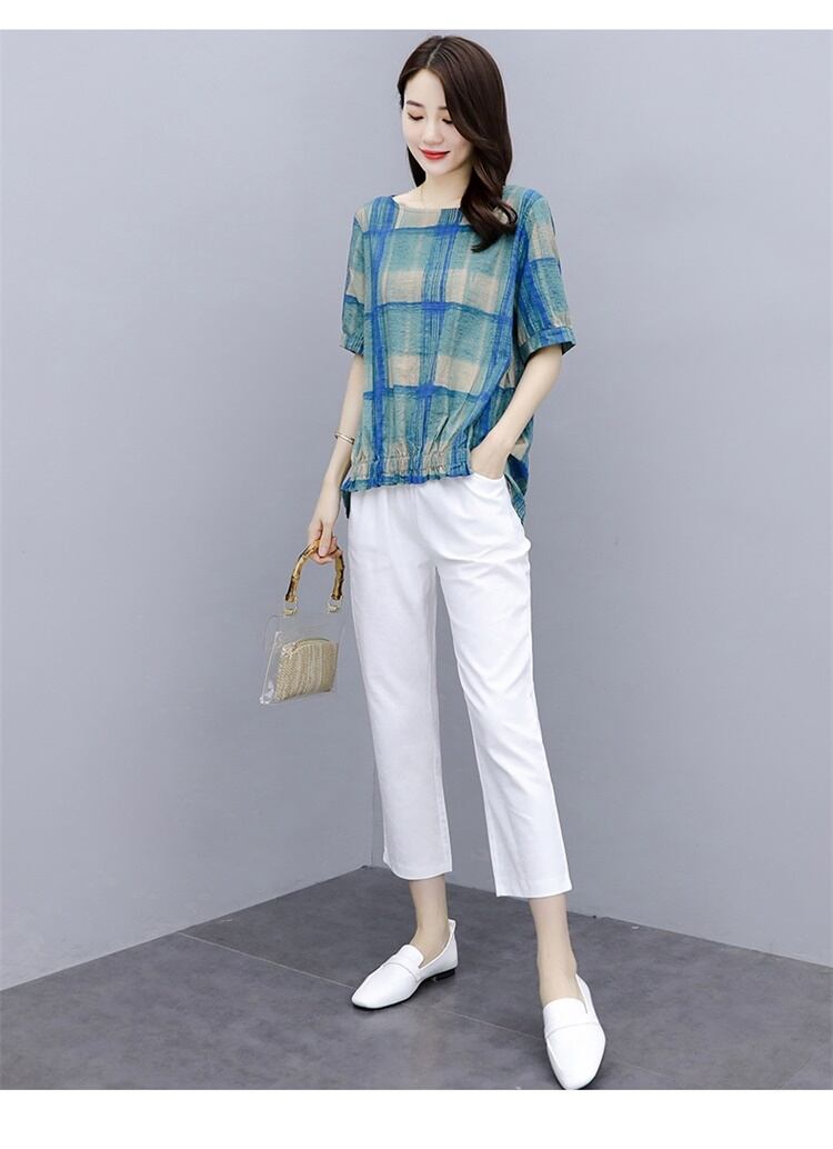 2021年夏の新しいプラスサイズのファッションコットンとリネンのスーツ女性のルーズ半袖チェック柄トップ9ポイントパンツツーピーススーツ 大きめサイズ サマー 夏物 TB2-12 TB2-127636792601