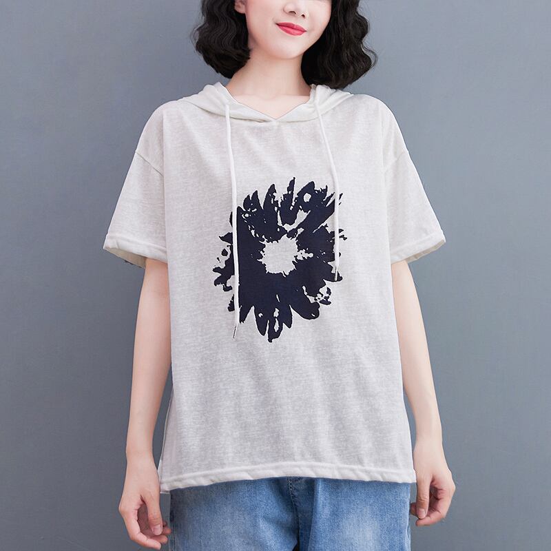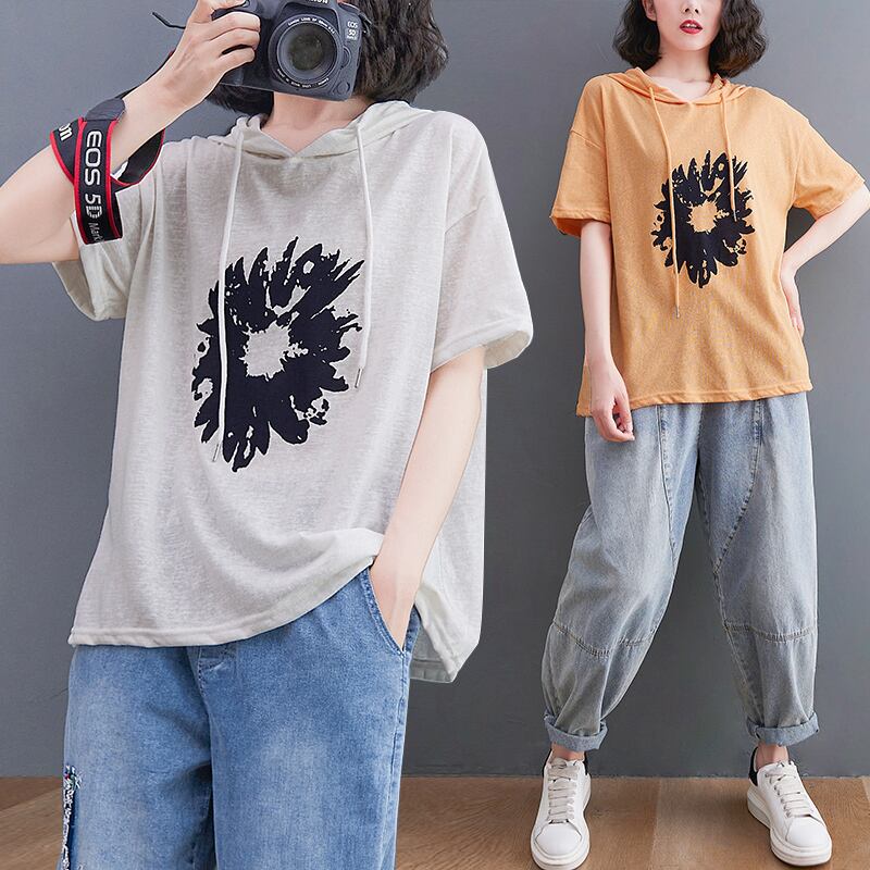 2021年の綿とリネンのフード付きプリントデイジー半袖Tシャツ女性夏の新しいリネンルーズファッショントップ コットン サマー 夏物 TB2-12 TB2-1235307654598