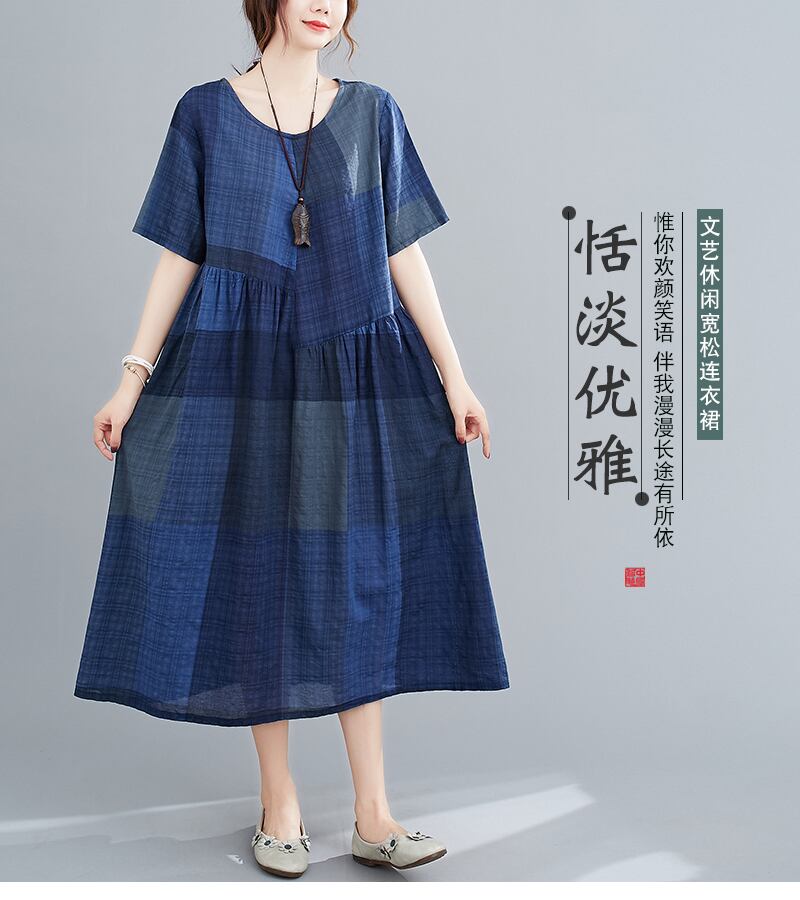 夏の文芸チェック柄コットンとリネンの半袖ドレスの不規則なステッチは薄くて大きいサイズのルーズカジュアルミドル丈スカートの女性 大きめサイズ サマー 夏物 TB2-12 TB2-122254970885