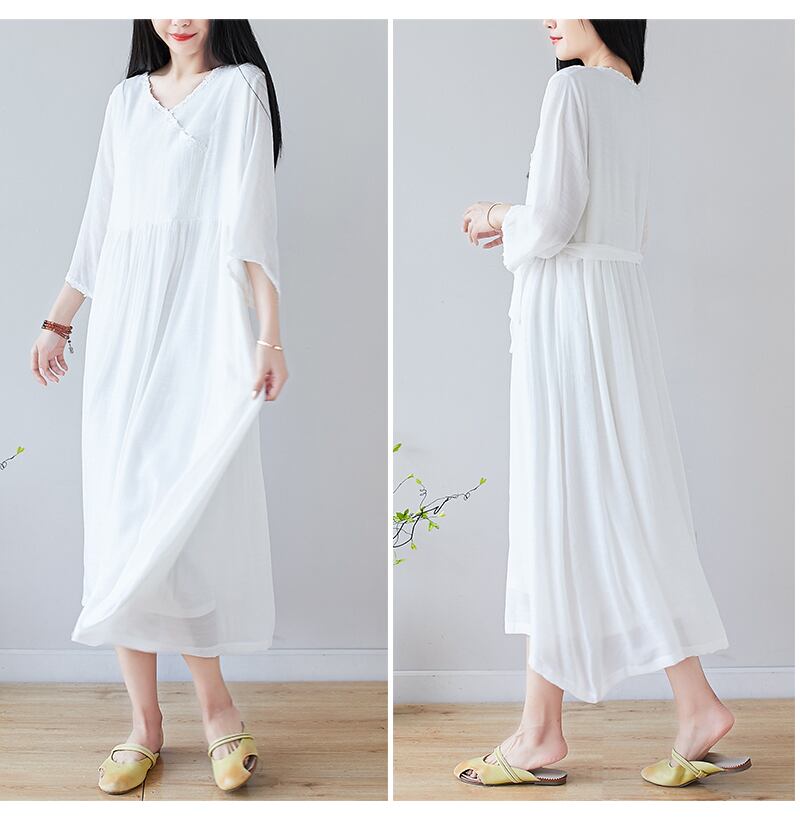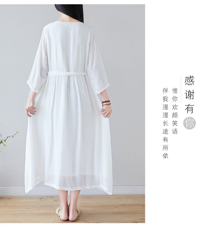綿とリネンのドレス、夏のストライプ、ミドルスリーブ、ウエスト、薄い、ルーズ、大きいサイズ、年齢を減らす、洋風、文芸、レトロ、妖精のドレス コットン 大きめサイズ サマー 夏物 TB2-12 TB2-1243507282743