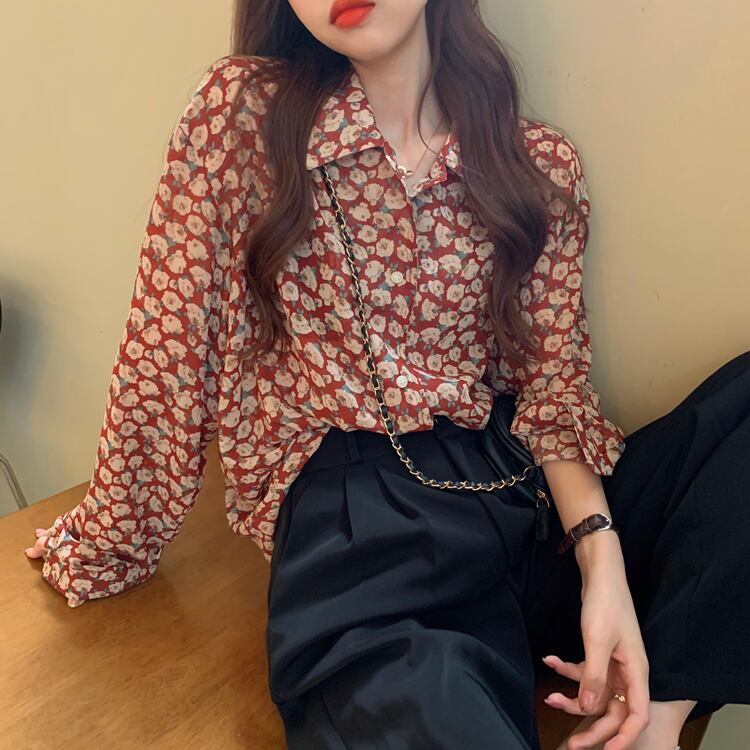 女性の2021年の新しい流行の香港スタイルのプリントシャツのデザインセンスニッチライトおなじみのレトロな香港フレーバーフローラルシフォントップ 花柄 TB2 TB254813155681