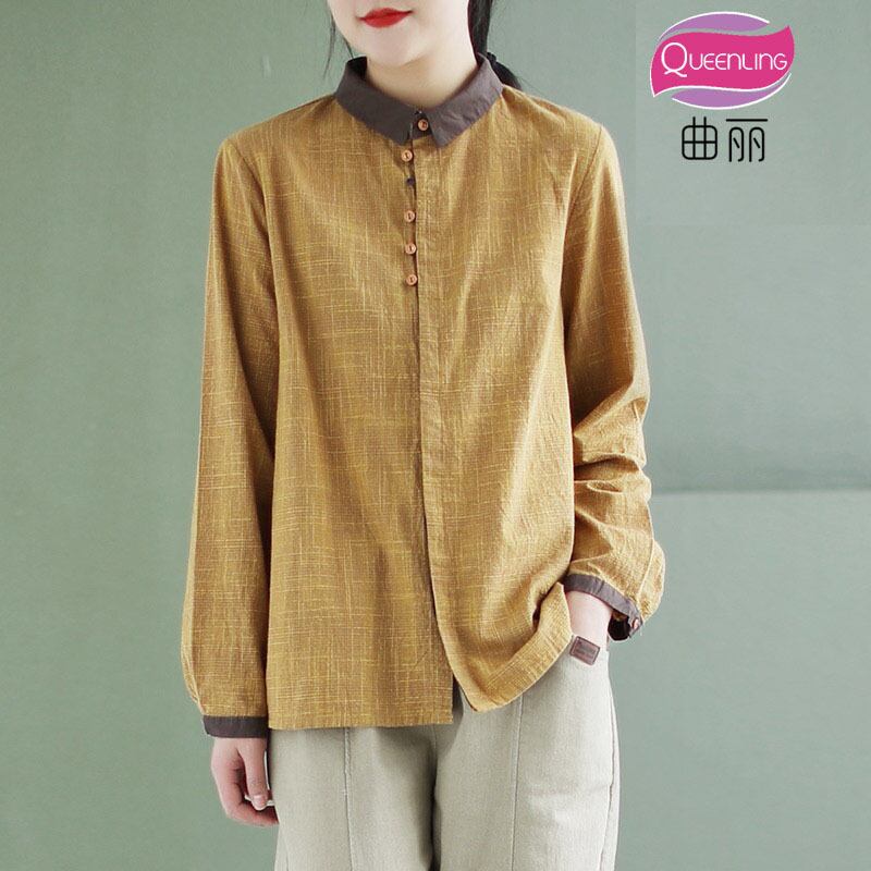 2021年レトロ文学長袖ラペルコットンとリネン糸染めチェック柄シャツ女性デザイン香港スタイルの文学ファントップのセンス ロング TB2-11 TB2-1173928032277