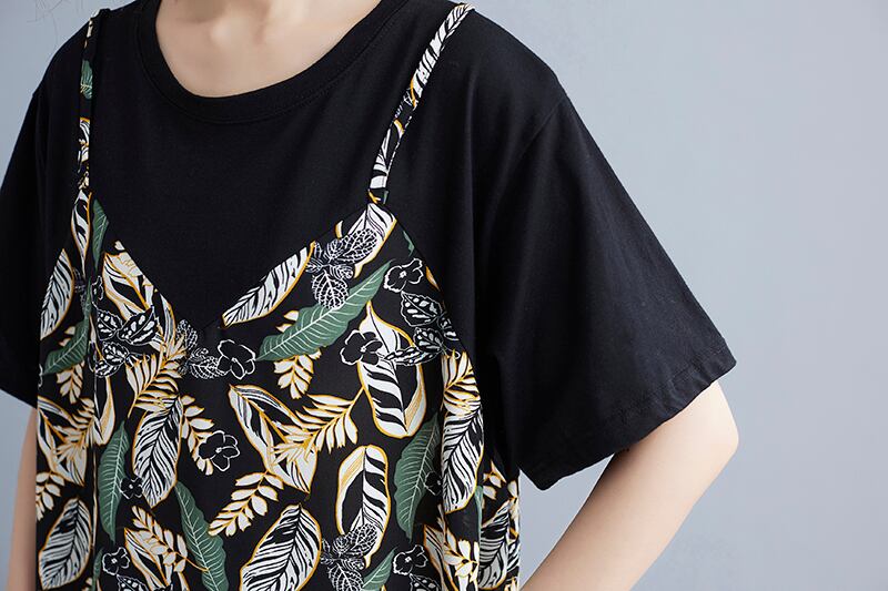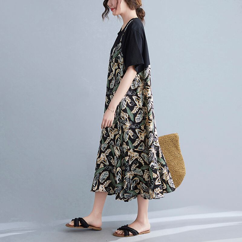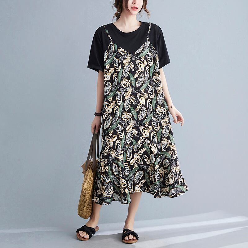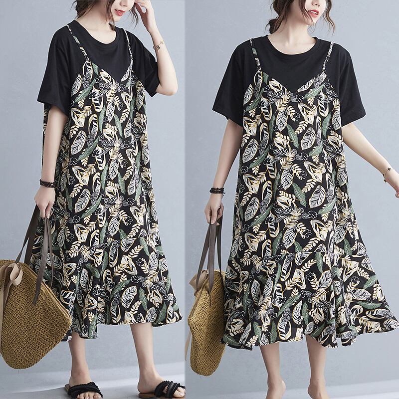 フェイクツーピースサスペンダードレスレディースミドル丈2021新しいルーズラージサイズは薄いフリルフローラルスカート夏でした 大きめサイズ サマー 夏物 花柄 TB2-8 TB2-876963707264