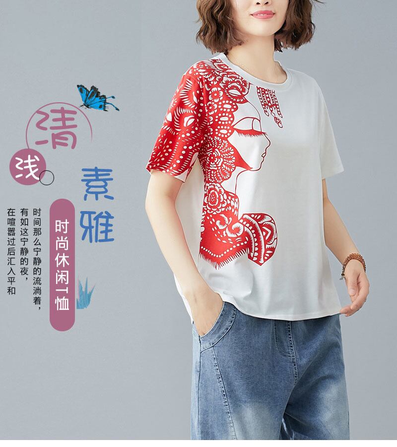 ルーズラージサイズのレトロなラウンドネックコットン半袖Tシャツレディースサマーチャイニーズスタイルプリントボトミングシャツトップ 大きめサイズ 夏物 Oネック TB2-11 TB2-119255187222
