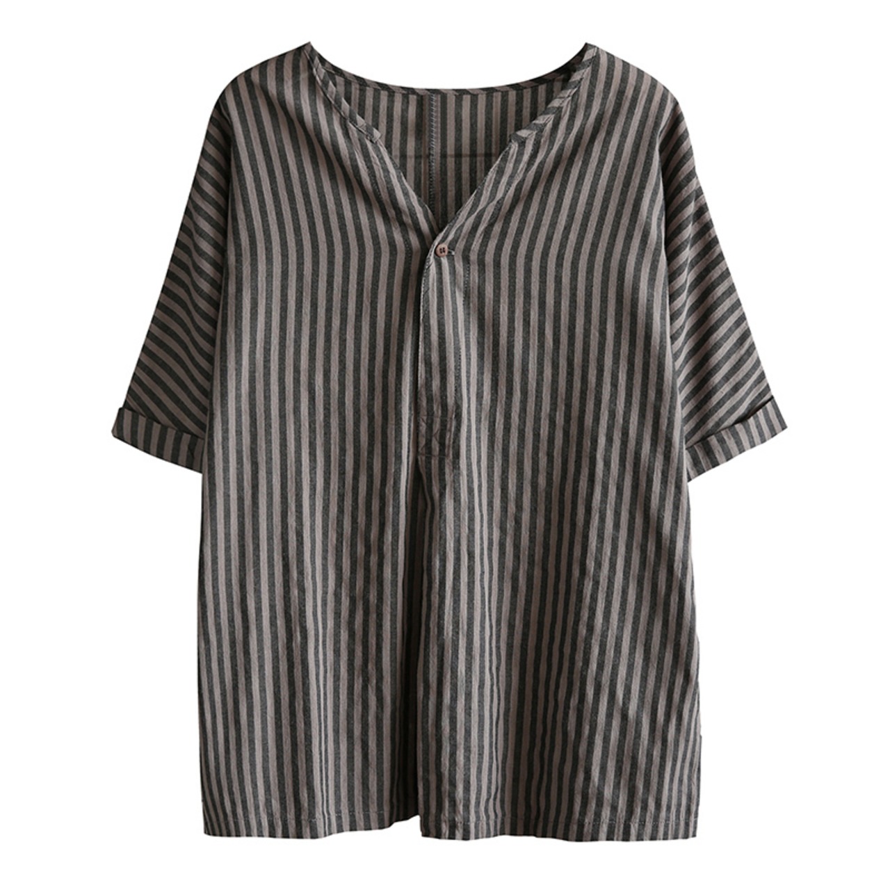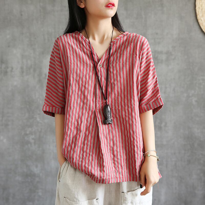 レトロなルーズVネックリネン半袖シャツレディース2020夏の新しいワイルド縦縞Tシャツコットンとリネントップ サマー 夏物 ストライプ TB2-11 TB2-1146004772684