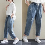 春の新バージョンのラージサイズの破れたジーンズの女性のルーズハーレムパンツは薄くて用途の広い伸縮性のあるウエスト9ポイントパンツです エラスティック 大きめサイズ スプリング 春物 TB2-8 TB2-831682739587