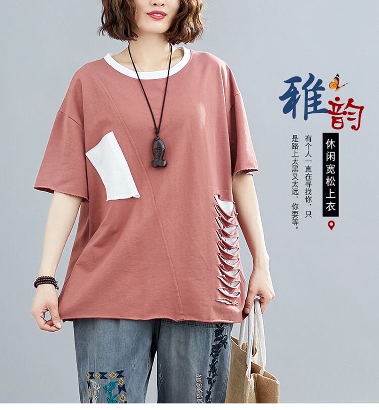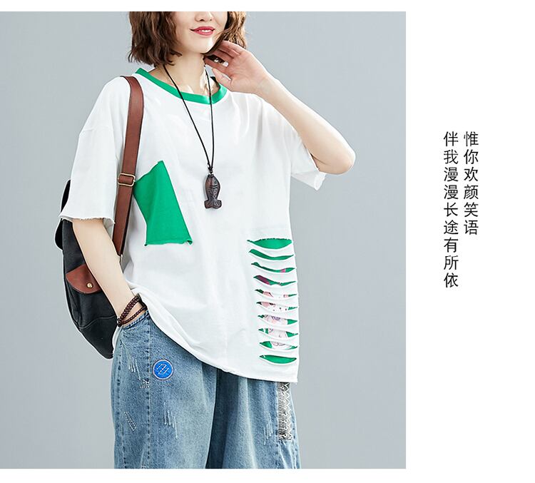 夏の女性のファットMMルーズリテラシープラスファットプラスサイズの破れた半袖Tシャツは薄くて用途の広いカラーパッチトップでした 大きめサイズ サマー 夏物 TB2-8 TB2-820493011933