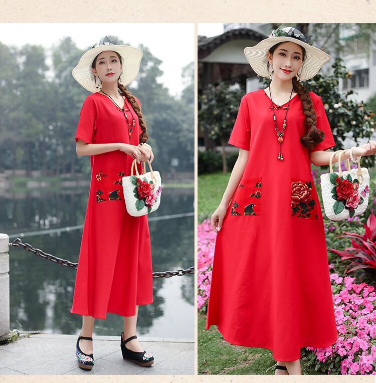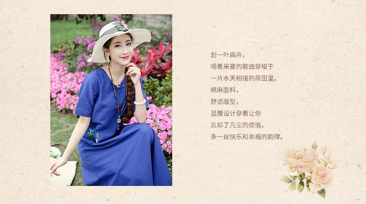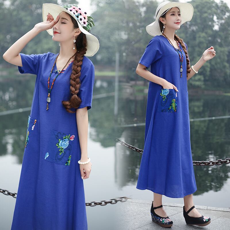 2021年夏の新しいエスニックスタイルのコットンとリネンのレトロなディスクバックルフローラルステッチルーズで薄いミドル丈のドレスの女性 サマー 夏物 花柄 TB2-12 TB2-1256783821542