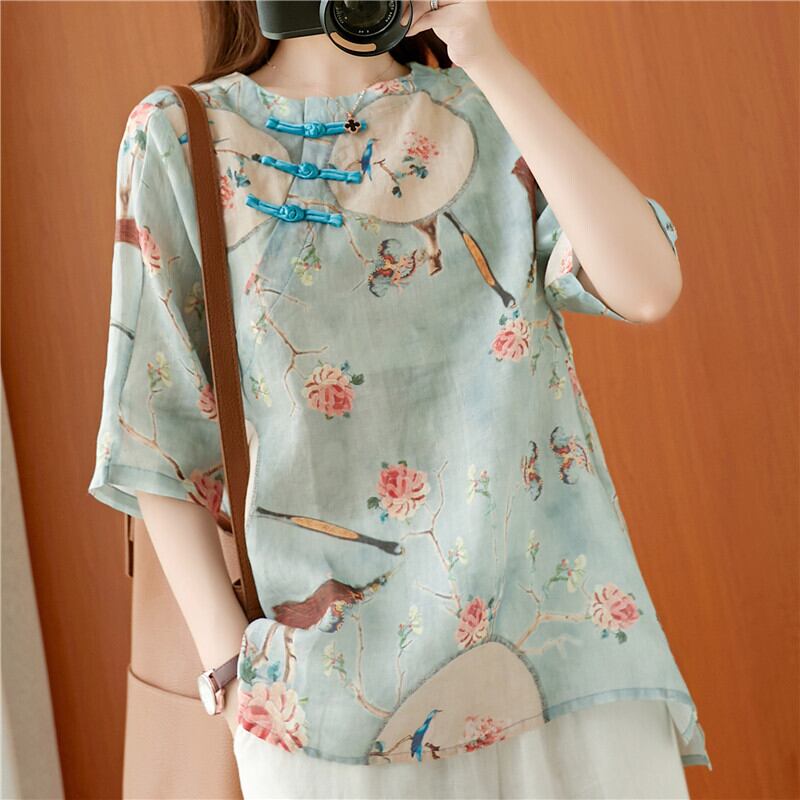 チャイニーズスタイルのラミー年齢を減らす気質5点スリーブティーサービス夏のレトロディスクボタンプリントシャツコットンとリネンシャツライト サマー 夏物 TB2-12 TB2-1281371253174