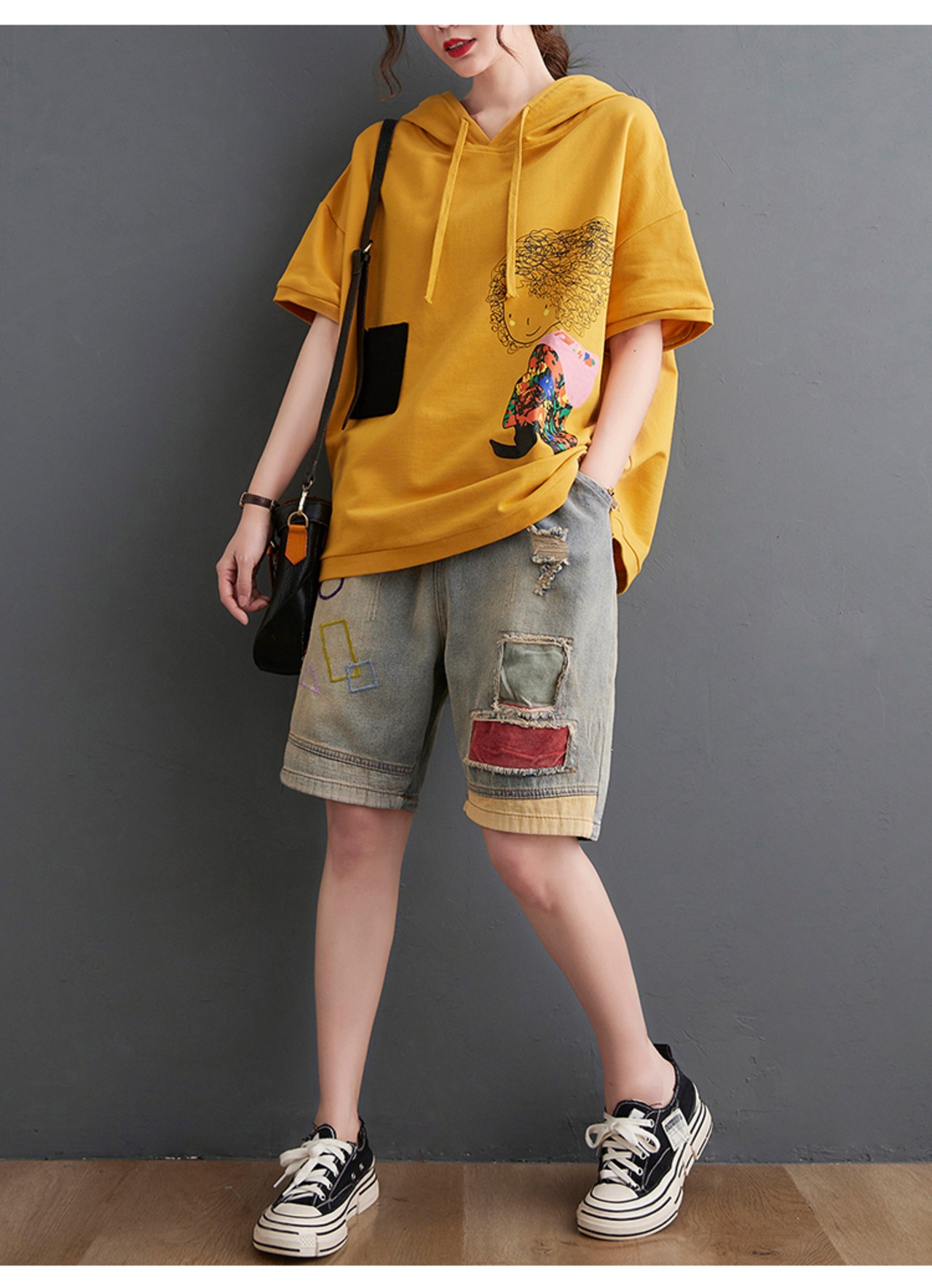 アートプリントステッチフード付き半袖Tシャツ女性2021年夏の新しいルーズラージサイズカジュアルコットントップ 大きめサイズ サマー 夏物 TB2-12 TB2-1232909723378