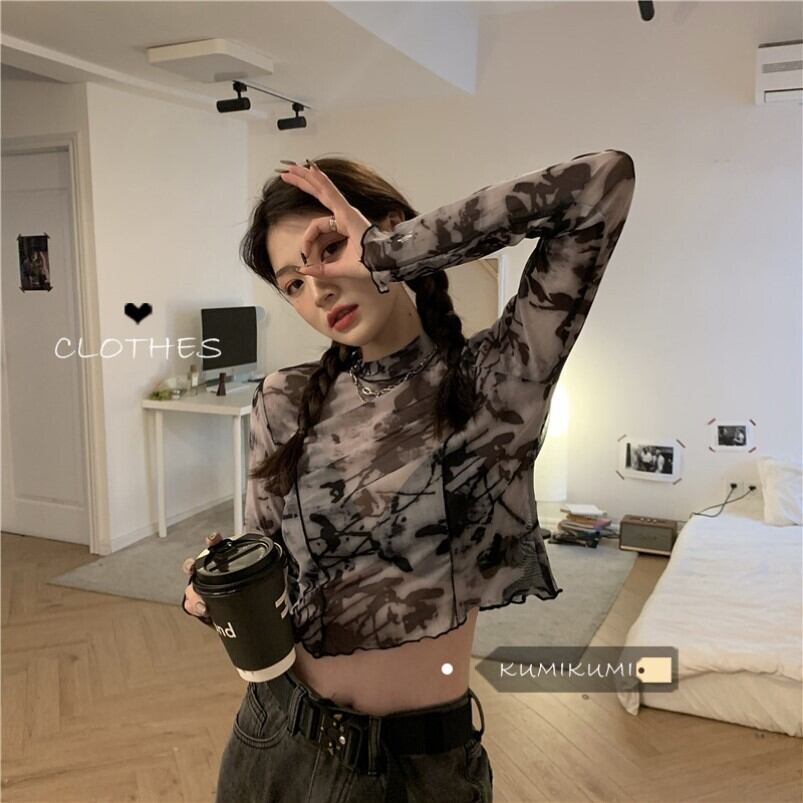 ホットガールショートタイダイトップレディース夏2021スタイル薄いベースシャツメッシュ日焼け止め長袖Tシャツ ロング サマー 夏物 TB2-6 TB2-628359949234