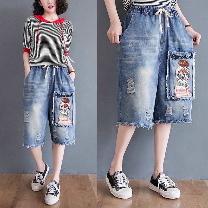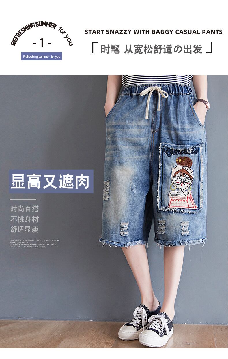 プラスサイズの女性の夏の漫画パッチ破れたデニムショーツオールマッチ伸縮性ウエストルーズで薄いワイドレッグ5ポイントパンツ エラスティック 大きめサイズ サマー 夏物 ブルマー TB2-8 TB2-893067798916