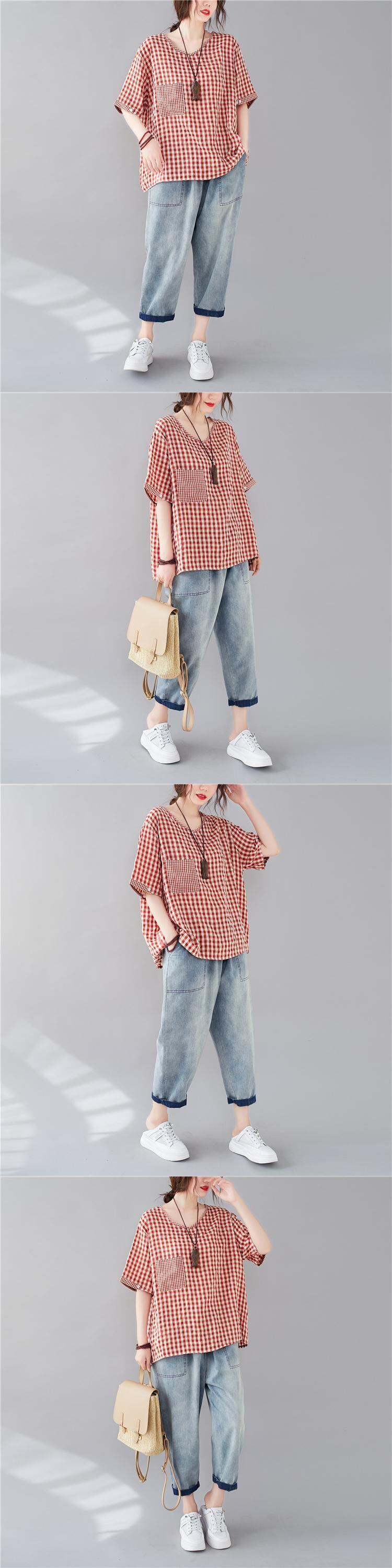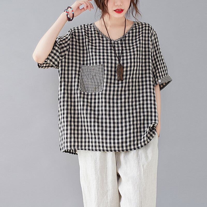 ラージサイズチェック柄半袖Tシャツレディース200ポンドファットシスターmmカジュアルポケットVネックトップレディースサマーニュースタイル2020 大きめサイズ 夏物 TB2-220072204236