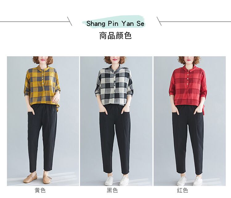 ラージサイズのレディースカジュアルツーピーススーツ5点袖スタンドカラーチェック柄シャツ+ピュアカラー9点パンツ2021年春新作 大きめサイズ スプリング 春物 TB2-273375597304