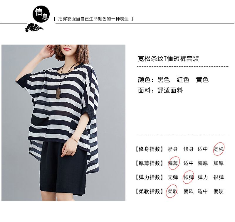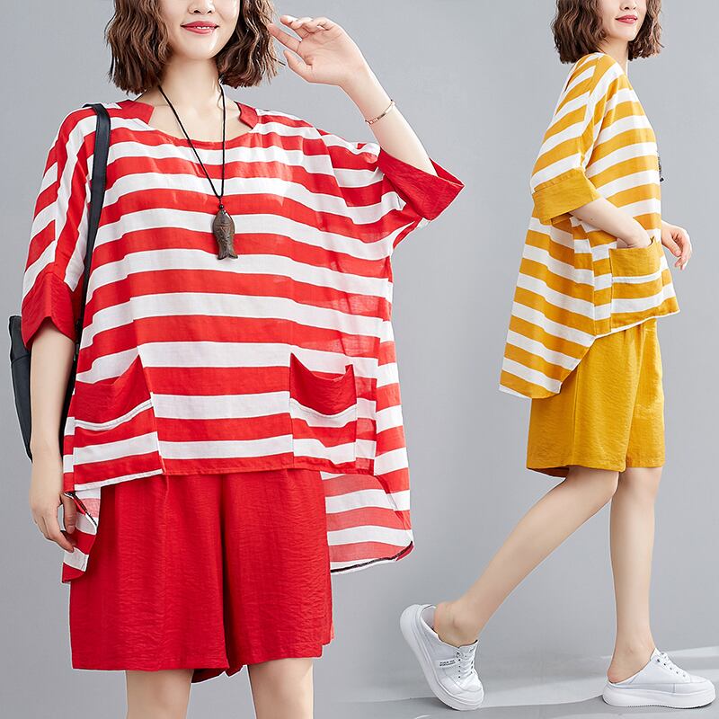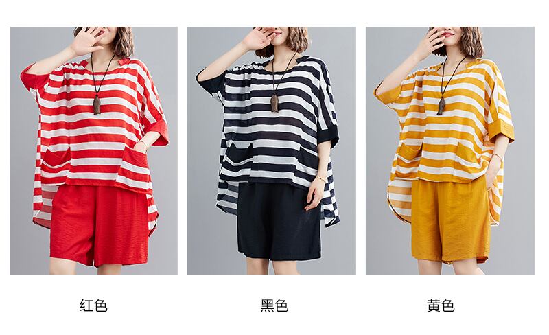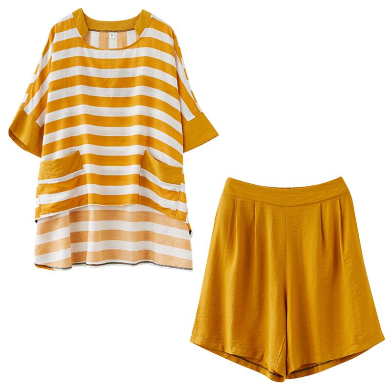 プラスサイズのファッションスーツ女性2021年夏新しいファットシスターストライプTシャツ+伸縮性ウエストカジュアルショーツツーピーススーツ エラスティック 大きめサイズ サマー 夏物 ブルマー TB2-230505158251