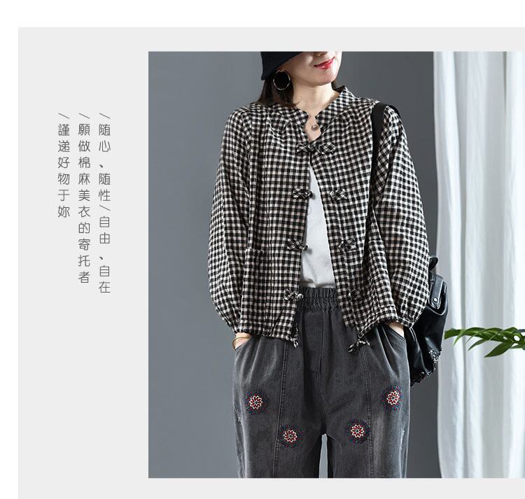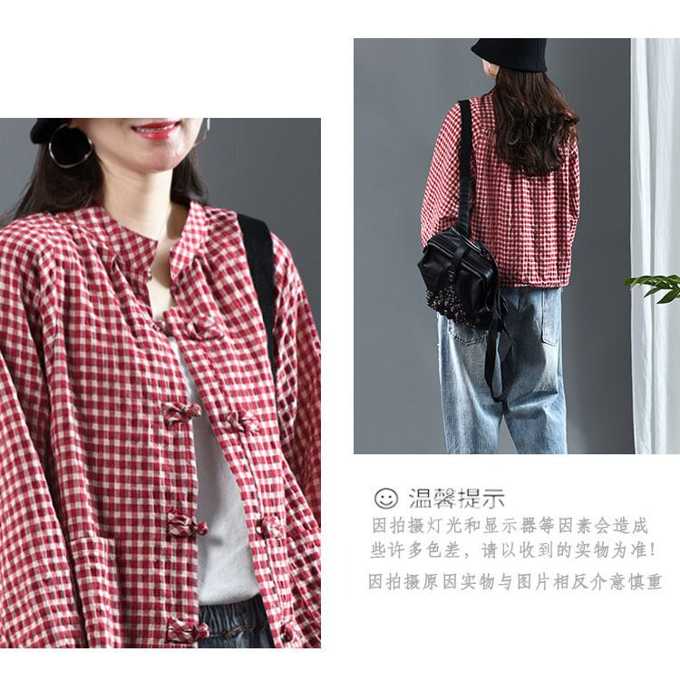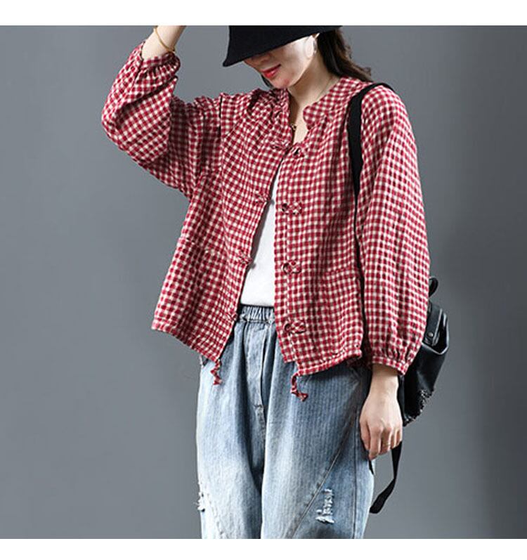 2020年初春新作リテラシーレトロディスクボタンチェック柄コットン&リネンカーディガン巾着スイングチェックトップコートブラウス レッド スプリング 春物 TB2-11 TB2-1194918396498