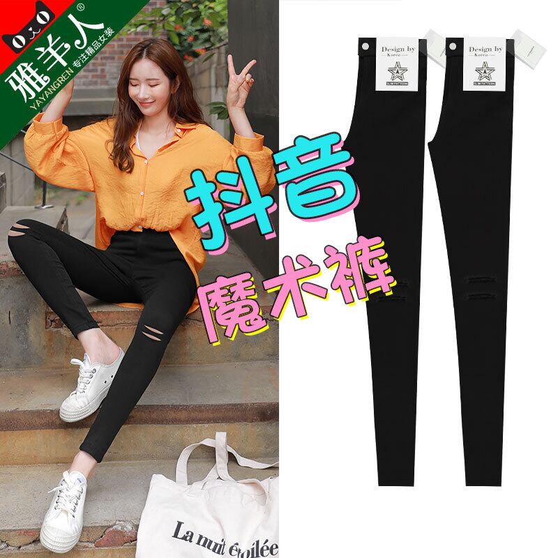 マジックレギンスレディースアウター夏薄切片ハイウエスト細黒小足ペンシル9点穴パンツ夏 ハイウェスト ブラック サマー 夏物 TM2-5 TM2-574957230273