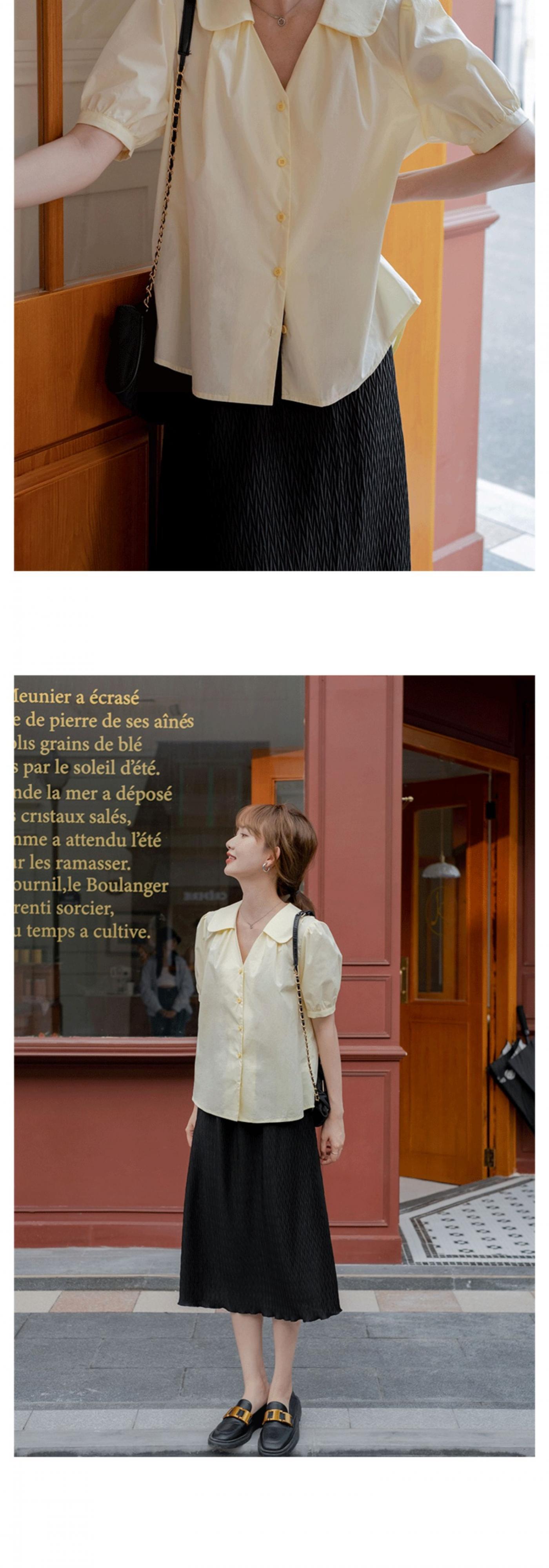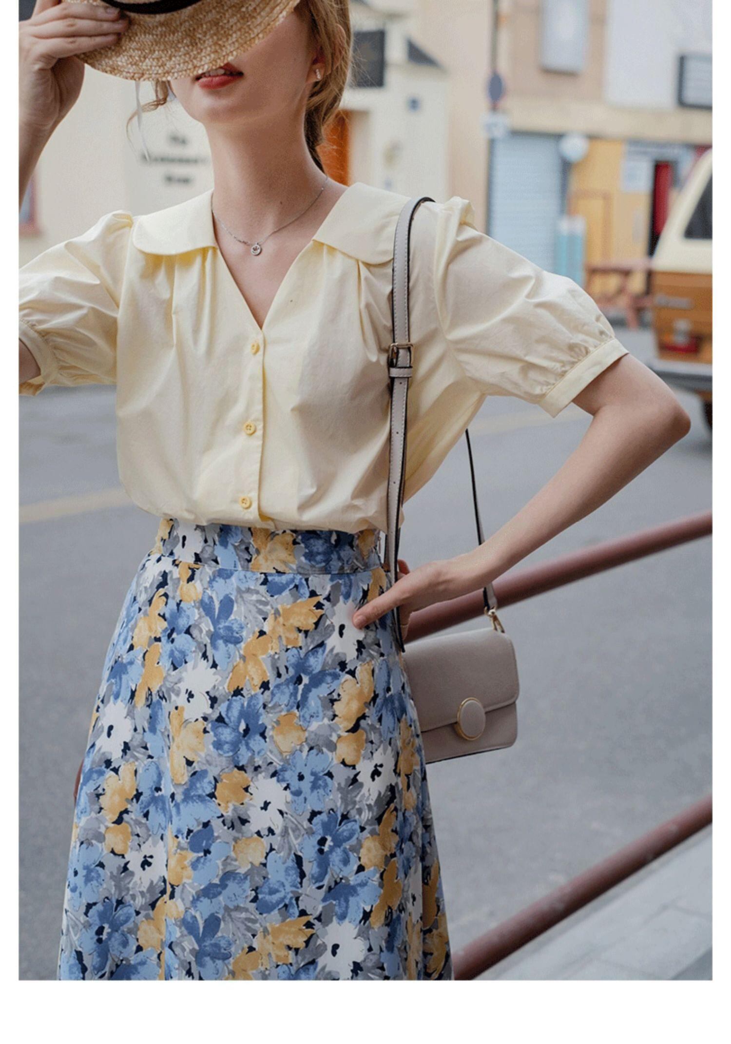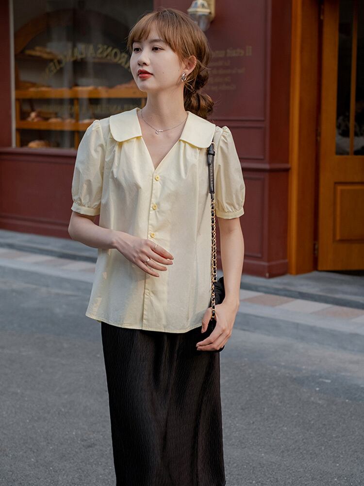 フレンチドールカラーシャツ女性夏レトロ香港スタイルデザインニッチパフスリーブトップVネック半袖シャツ サマー 夏物 TB2-15 TB2-1547020363776