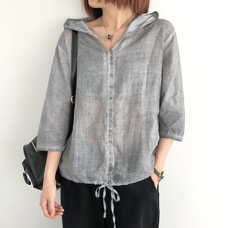 コットンとリネンのシャツ女性の夏の新しいスタイルの文学的なルーズな薄いセクション七分袖シャツ古いレトロなフード付きシャツジャケット サマー 夏物 TB2-9 TB2-973261774598