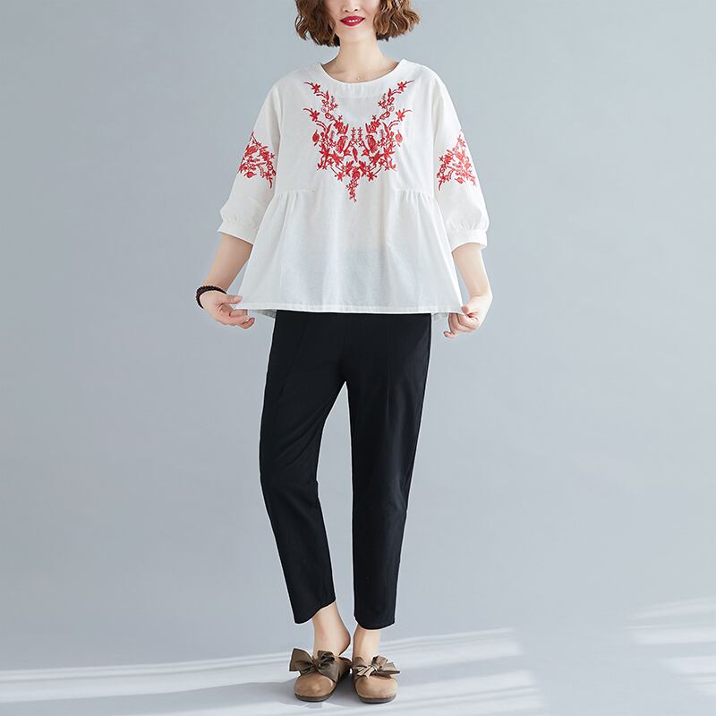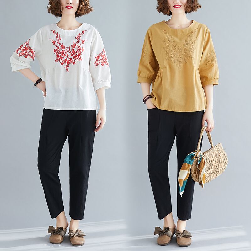 2021年春夏新作レディースリテラリーコットン&リネン刺繍ラウンドネック七分袖シャツハーレムパンツツーピーススーツ スプリング 春物 サマー 夏物 Oネック TB2-12 TB2-1248348305993