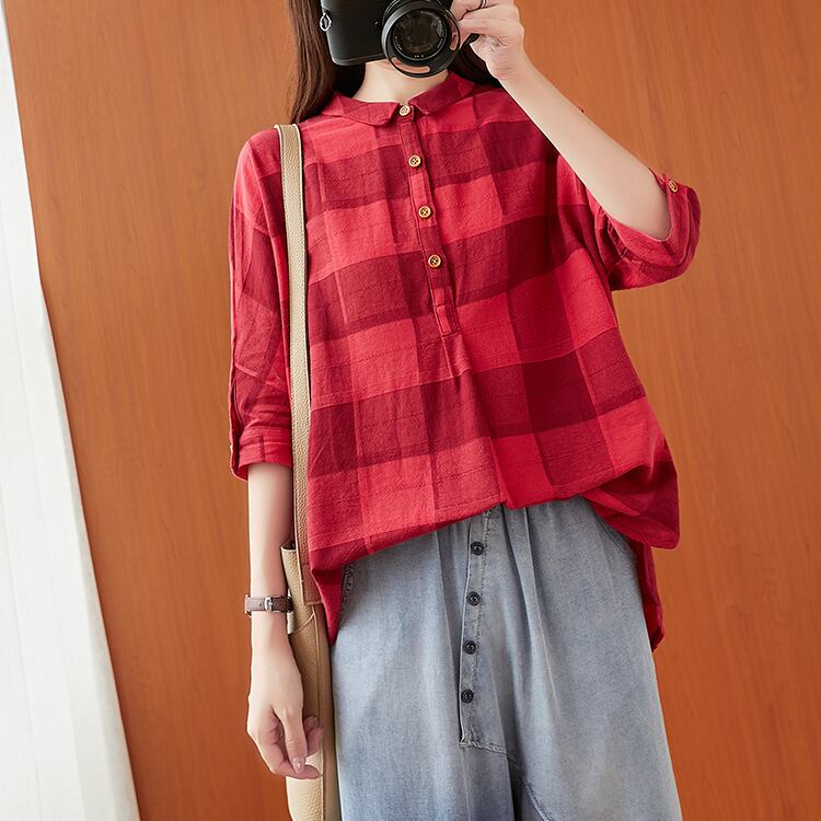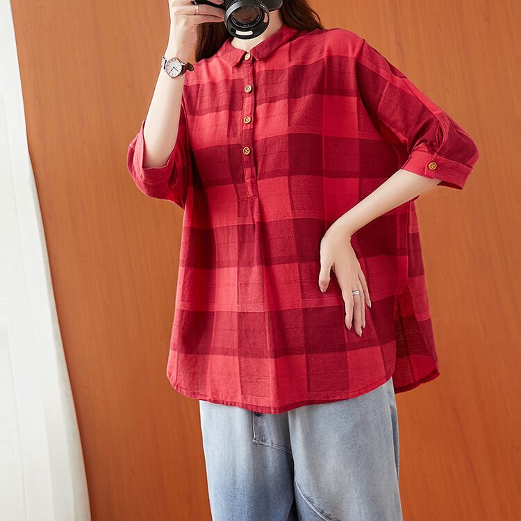 2021年春の新しいスタイルの文学的なプラスサイズの女性の格子縞の綿とリネンのシャツ七分袖ルーズカジュアルオールマッチブラウス コットン 大きめサイズ スプリング 春物 TB2-12 TB2-1286840607935