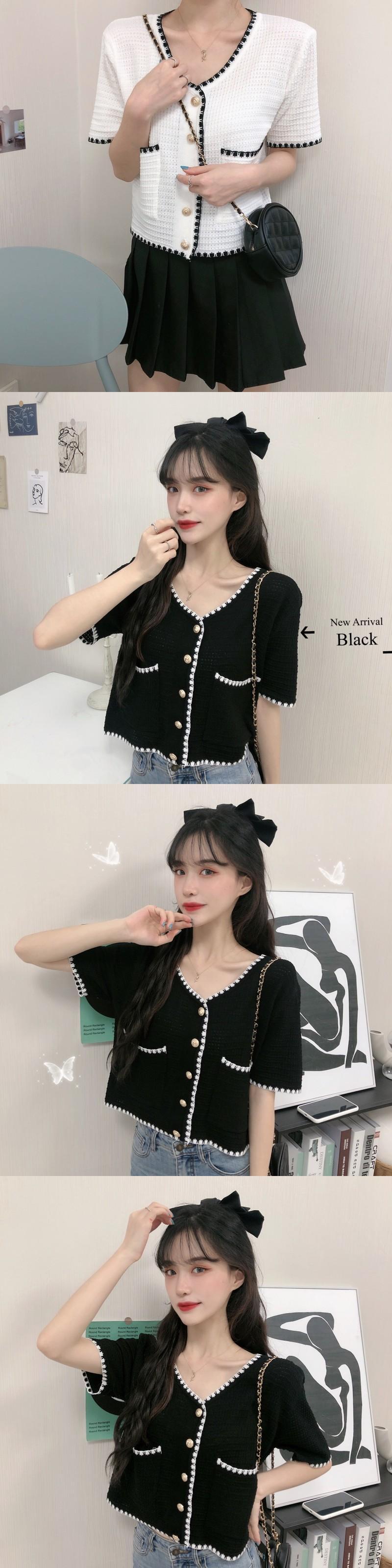 夏のショートフレグランスブラックワイルドVネックアイスシルクニットカーディガンデザインセンスニッチ半袖Tシャツトップ女性 サマー 夏物 TB2 TB257801419996