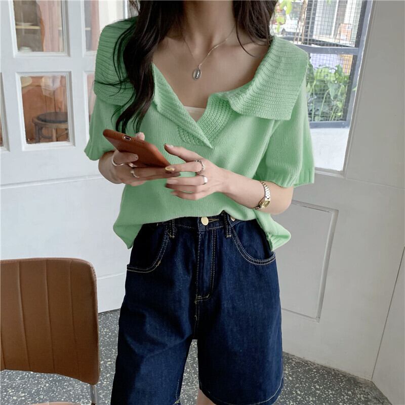 スタイルVネックニッチデザイン半袖シャツ女性夏あごルーズファッションオールマッチ気質ピュアカラートップ サマー 夏物 TB2 TB253260193238