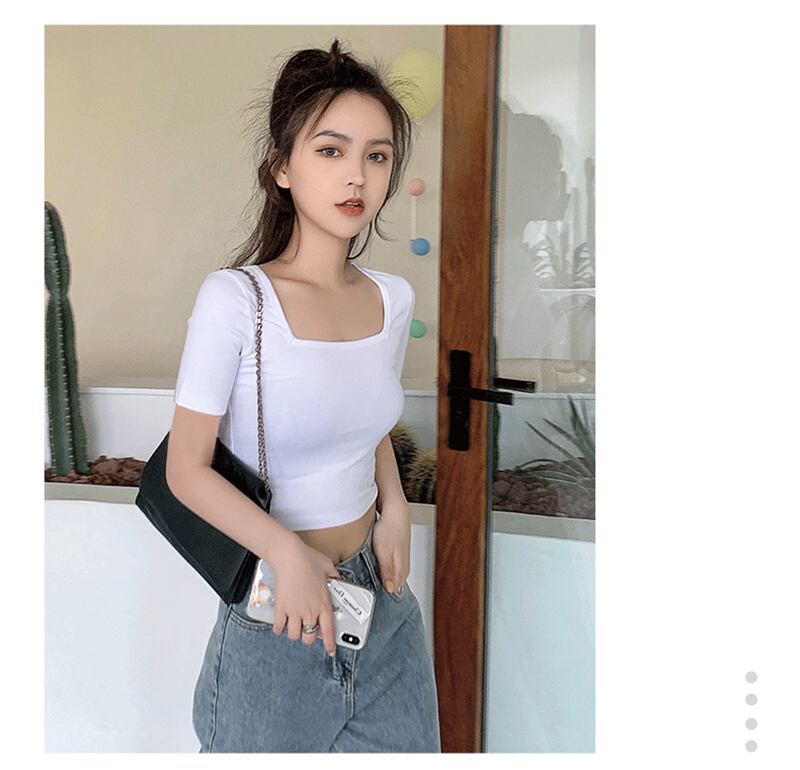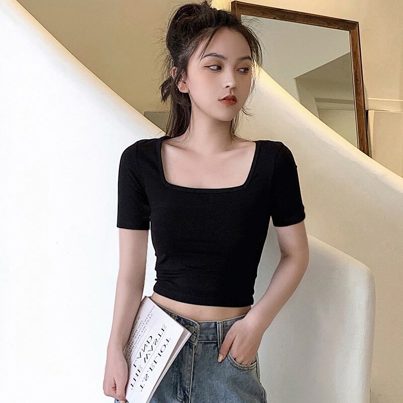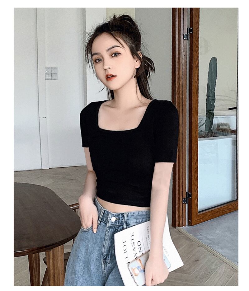 無地Tシャツレディース半袖夏Uネックタイトフィットボトミング半袖ボディシャツフレンチスクエアネック露出鎖骨トップ サマー 夏物 ソリッドカラー スクウェア TM2-3 TM2-337371167575