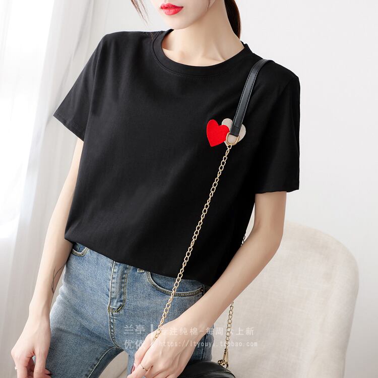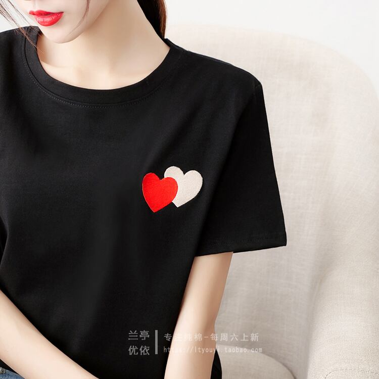 夏半袖純綿Tシャツレディースラブ刺繍Tシャツスチューデントブラックスリムショートボトミングシャツトップス レッド コットン サマー 夏物 ピュア TB2-16 TB2-165010831814