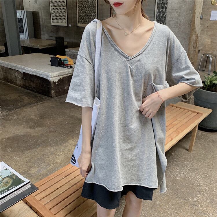 香港スタイルの婦人服2021年夏バージョンのルーズコットンミドル丈スプリットVネックシャツ半袖Tシャツ女性トレンド サマー 夏物 TM2-3 TM2-376192147429