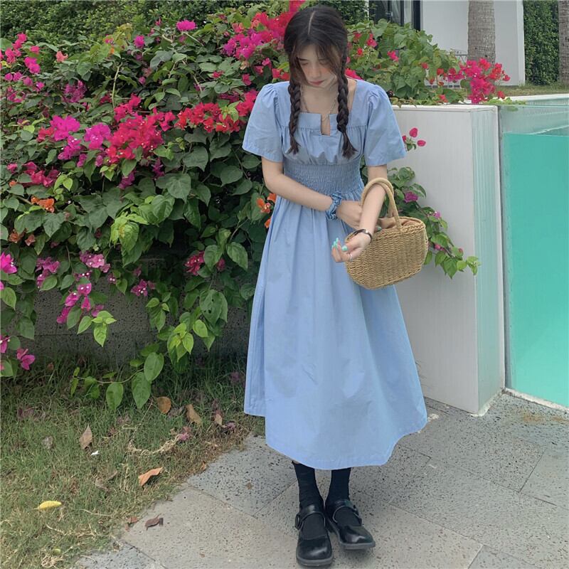 ゲンジュ初恋スカートセンレトロ優しい気質ブルーロングスカート女性夏妖精スクエアカラースウィートフレンチドレス 大人ガーリー キュート カジュアル サマー 夏物 スクウェア TB2 TB230332402693