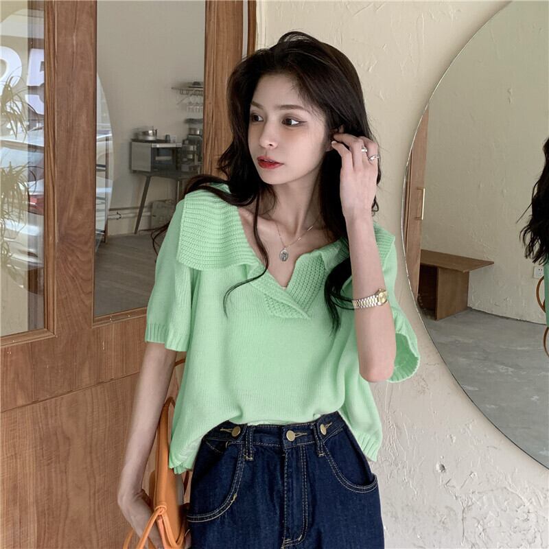 ネットレッドニットTシャツ半袖女性夏デザインセンスニッチルーズシンアイスシルクVネックカバーベリートップ サマー 夏物 TB2 TB284208269208
